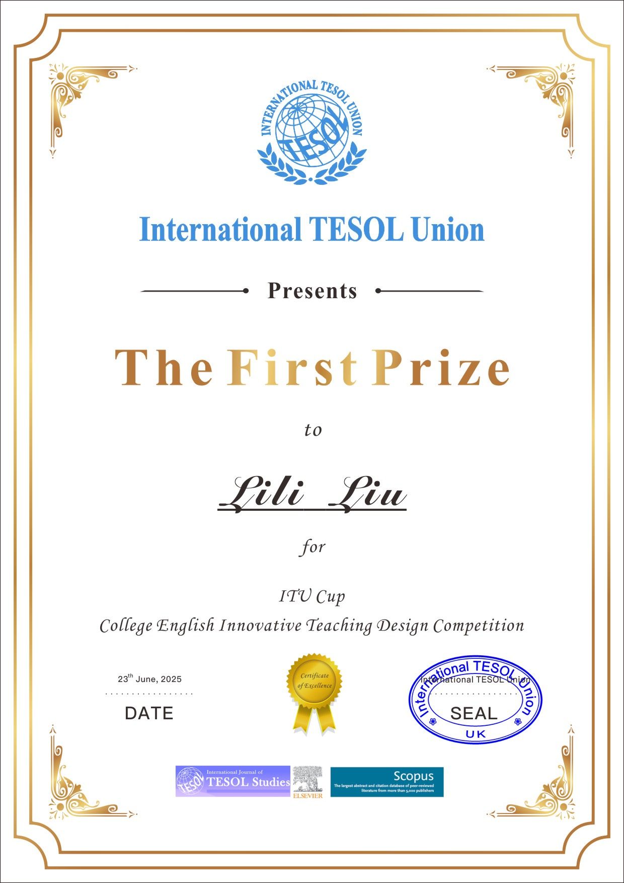 At the recently concluded "Union Cup: College English Teaching Design Innovation Competition" hosted by the International TESOL Union (ITU,founded in 2012, registered in the UK in 2019), Liu Lili, Deputy Director of the College English Department at the HXIT's School of Foreign Languages , won the first prize with her innovative teaching design. This achievement marks HXIT’s first highest honor in this international teaching competition, underscoring global recognition of its English teaching standards.