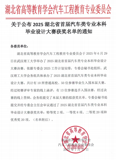 近日,首届湖北省汽车类毕业设计大赛结果揭晓,beat365智能制造学院学生表现突出,荣获省级二等奖1项、优秀奖4项,充分展现了在汽车领域的应用能力与专业素养。此次赛事由湖北省高等教育学会汽车工程教育专业委员会主办,吸引了全省10所高校参与,竞争激烈,beat365获奖数量与质量在同类院校中均位居前列。