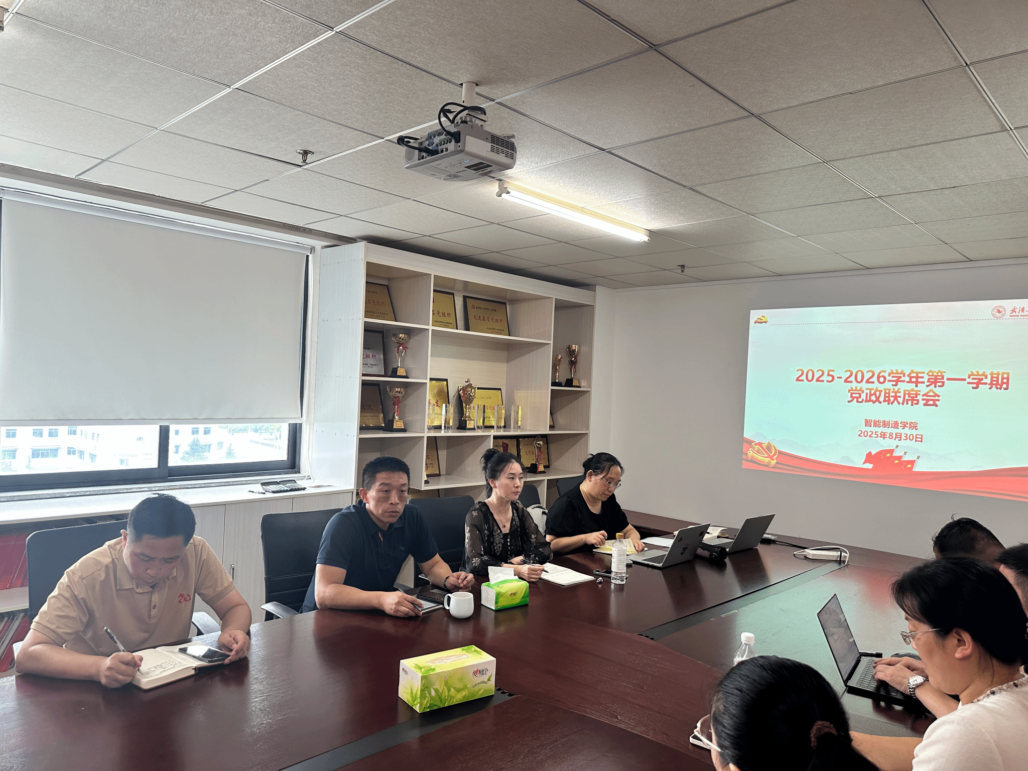8月30日上午,智能制造学院召开新学期首次党政联席会。会议由学院执行院长齐洪方主持,院党总支副书记靳路民、副院长汪芳、副院长李媛、各单位主任及副主任参加会议。
