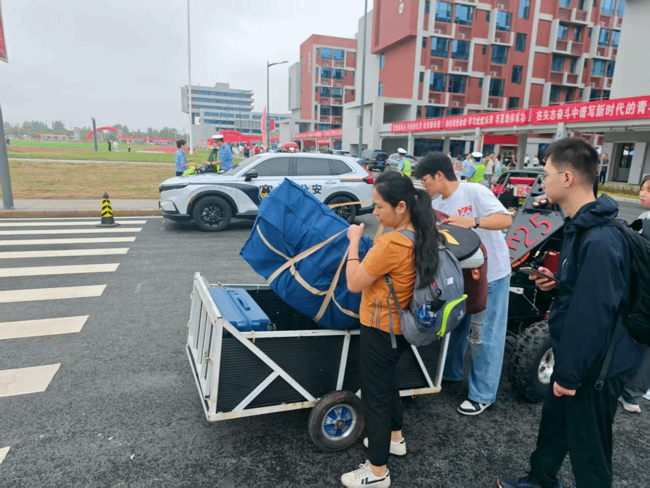 从自主研发到实际应用,E25智能车凝聚着华耀追梦车队成员的心血,8月在中国汽车工程学会主办的巴哈大赛中荣获电车组全国第二名、本科组第一名,并以总成绩全国二等奖。迎新期间,它凭借稳定的性能,轻松承载新生行李,在指定路线有序行驶,不仅减轻了新生及家长的搬运压力,更直观展现了学院在智能制造领域的实践成果,让新生刚进校园就感受到科技的温度与力量。