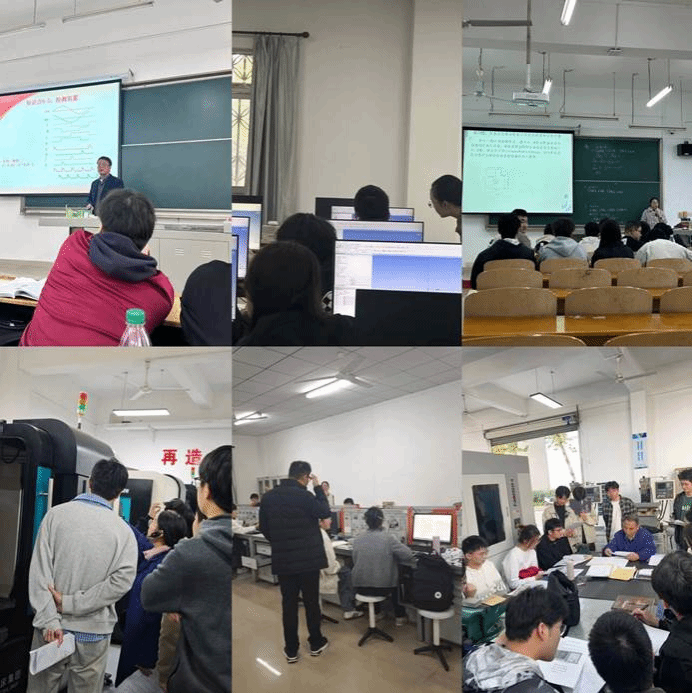 为深入了解核心课程教学实际、汲取优质教学经验,机自系统筹安排教师,分批次参与《数控技术》、《机械制造工艺学》、《机床电气控制》、《机械设计》以及《有限元分析与应用》等多门重点课程的助教工作及随堂听课。听课过程中,教师们认真记录教学环节设计、重难点突破方式及师生互动技巧,重点关注任课教师的教学设计逻辑与实践教学创新点,为后续教学改进积累第一手资料。图1为多位教师听课照片。