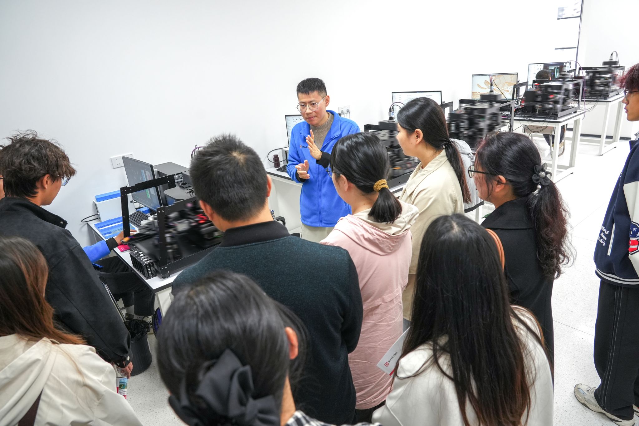 11月11日下午2点,学生们怀着期待的心情抵达武汉赛维尔生物科技有限公司,活动首先从公司产品介绍拉开帷幕。在产品展示区,刘宇结合实物与图文资料,向学生们详细介绍了公司自主研发的三维冷冻研磨仪、全自动切片扫描系统等核心生物仪器。刘宇一边操作仪器演示,一边讲解产品的技术原理、开发过程和应用场景。并无私分享了自己在产品研发过程中遇到的技术难题与解决方案,让学生们直观感受到生物仪器研发的严谨性与创新性,对专业未来的就业方向有了更具体的认知。