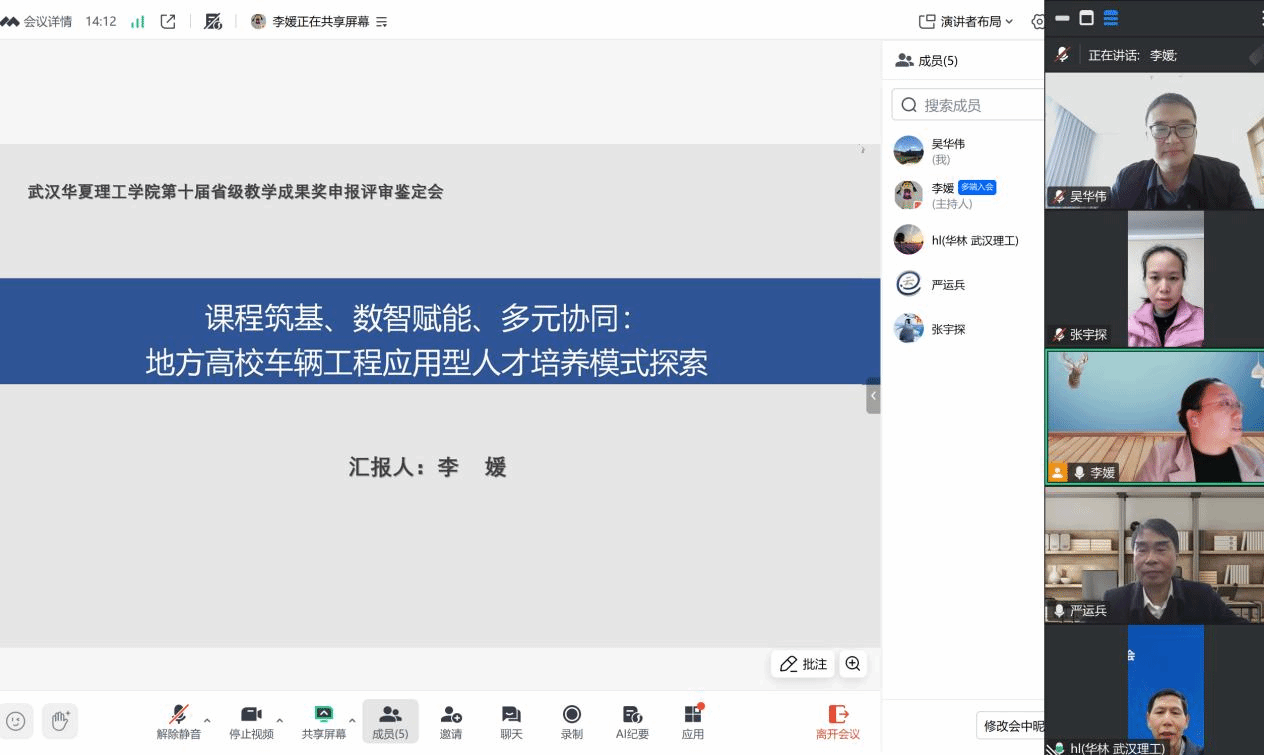 教学成果负责人李媛副教授代表团队介绍了项目的背景,总结了近年来面向汽车产业转型发展的过程中,车辆工程专业在课程体系建设、教学方法改革、协同共育方面所做的工作,汇报了人才培养取得的成果及在省内外高校推广的应用效果。
