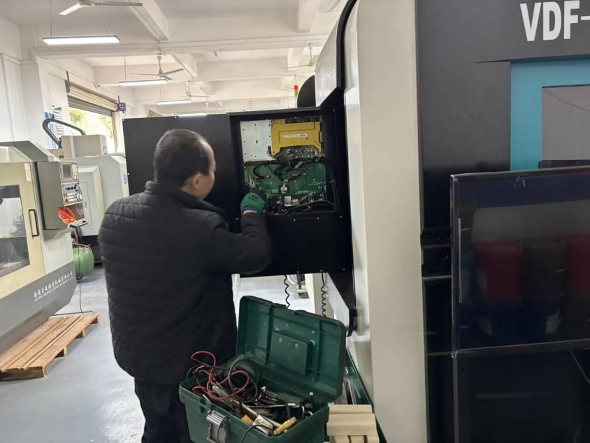 该数控机床是数控技术专业核心实训设备,承担着多个班级的实操教学任务。故障发生时,设备突然停机,经初步排查确定为油泵损坏,导致机床各运动部件无法获得有效润滑,若强行运转可能造成更严重的机械损伤。由于设备结构精密,校内维修人员不具备专业维修条件,实训中心立即联系设备合作单位武汉精研智创工程设备有限公司请求支援。