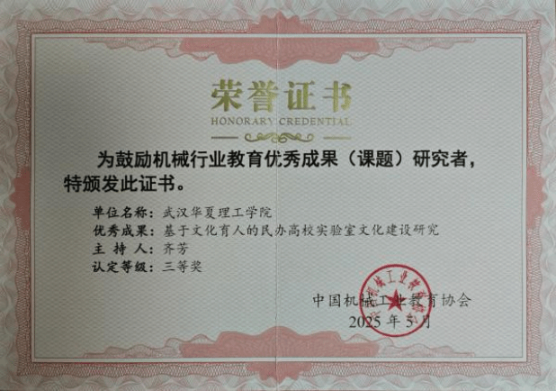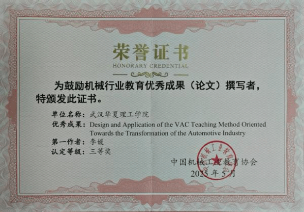 近日,中国机械工业教育协会公布了2025年度机械工业教育教学优秀成果认定结果,我院两位教师凭借出色的教科研成果脱颖而出,分别是李媛老师的论文《Design and Application of the VAC Teaching Method Oriented Towards the Transformation of the Automotive Industry》荣获论文优秀成果三等奖和齐芳老师的课题《基于文化育人的民办高校实验室文化建设研究》荣获课题优秀成果三等奖。这是我院在该项评选中首次获奖,标志着我院在机械工业教育教学领域的创新与实践取得了重要突破。