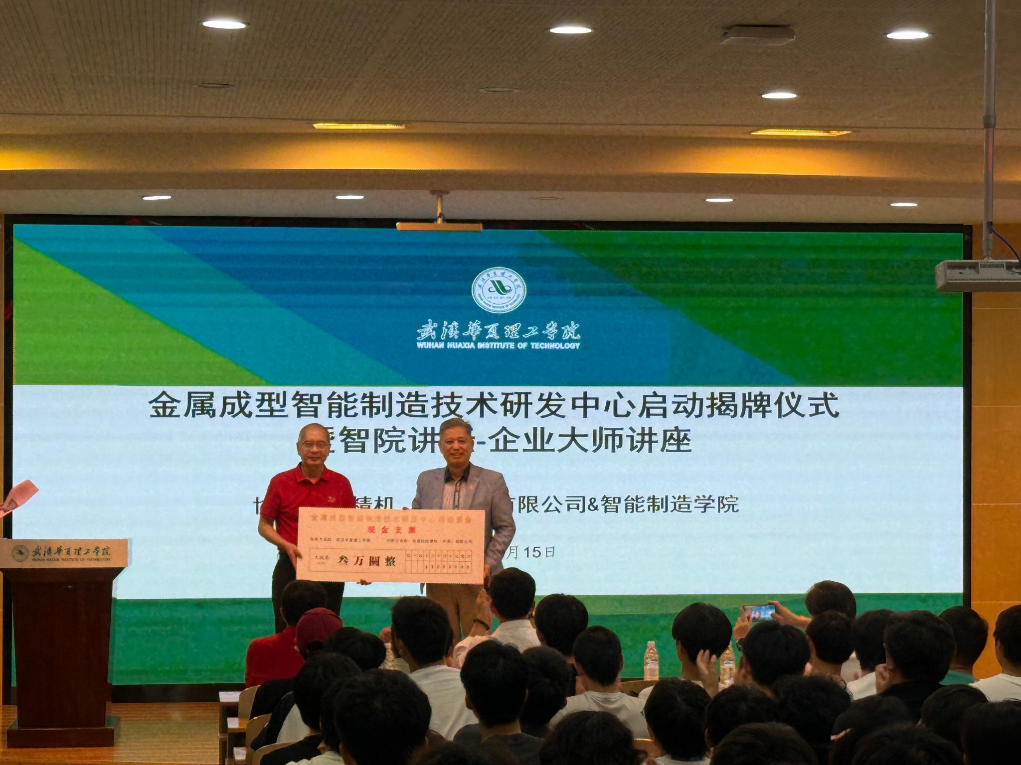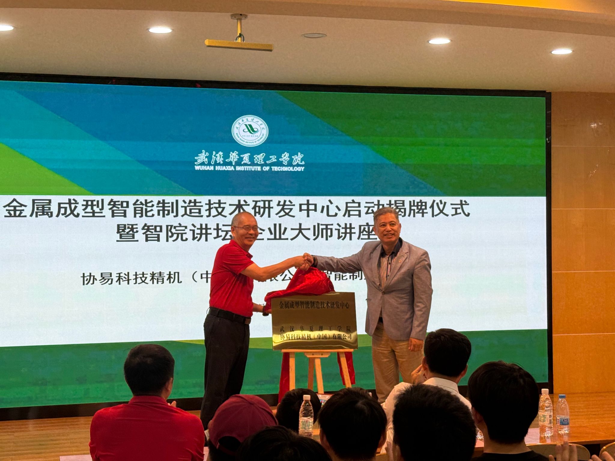 仪式现场,协易科技精机(中国)有限公司总经理刘国旺、beat365官方网站副校长丁成忠共同为金属成型智能制造技术研发中心揭牌。协易科技精机(中国)有限公司为研发中心投入启动经费3万元,用于技术攻关、课题研究,旨在通过产学研融合,推动金属成型智能制造领域的技术突破与人才培养,实现校企资源互补。
