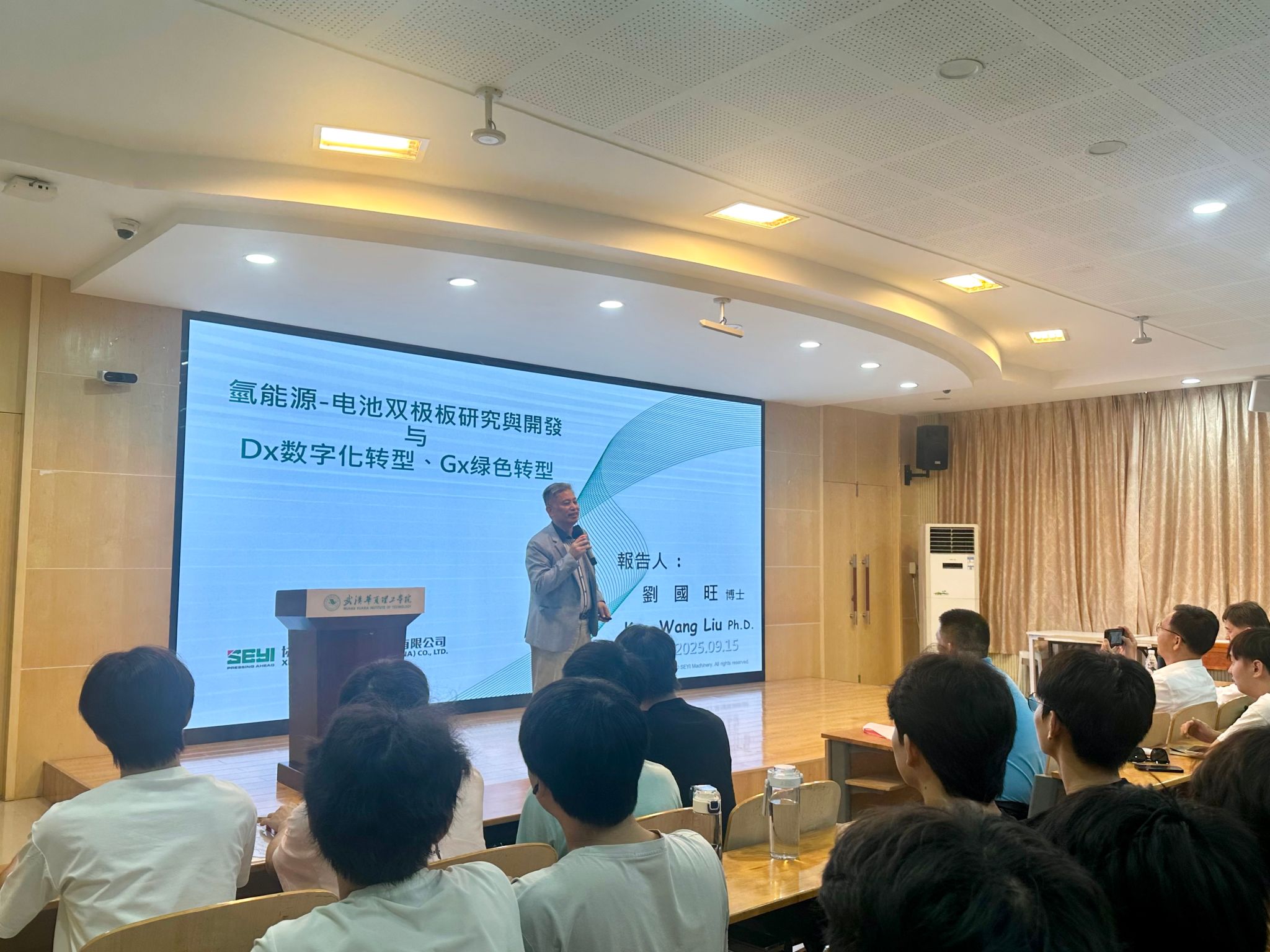 揭牌仪式后,刘国旺总经理以“未来的能源——氢能源”为主题开展讲座,深入浅出讲解氢能源的发展趋势与应用场景,生动内容让在场学生听得津津有味。同时,拥有博士学历的刘国旺还分享了个人求学经历、学术成果及荣誉故事,并结合协易科技的发展历程与管理经验,勉励同学们深耕专业知识,积极探索行业前沿,为智能制造领域发展贡献青春力量。