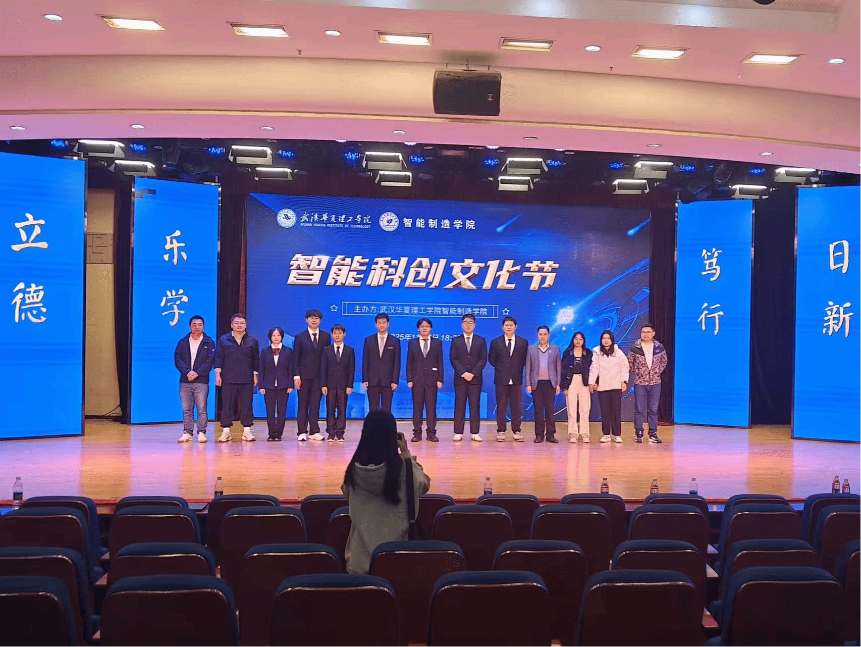 活动最后,师生在报告厅前合影留念。学院团总支副书记周立华在结束语中表示,学院后续会持续开设科创沙龙、项目辅导课,持续搭建科创交流平台,为培养智能制造领域创新型人才赋能提供更多资源支持,希望同学们以此次分享会为起点,在智能制造领域大胆探索、勇于实践。