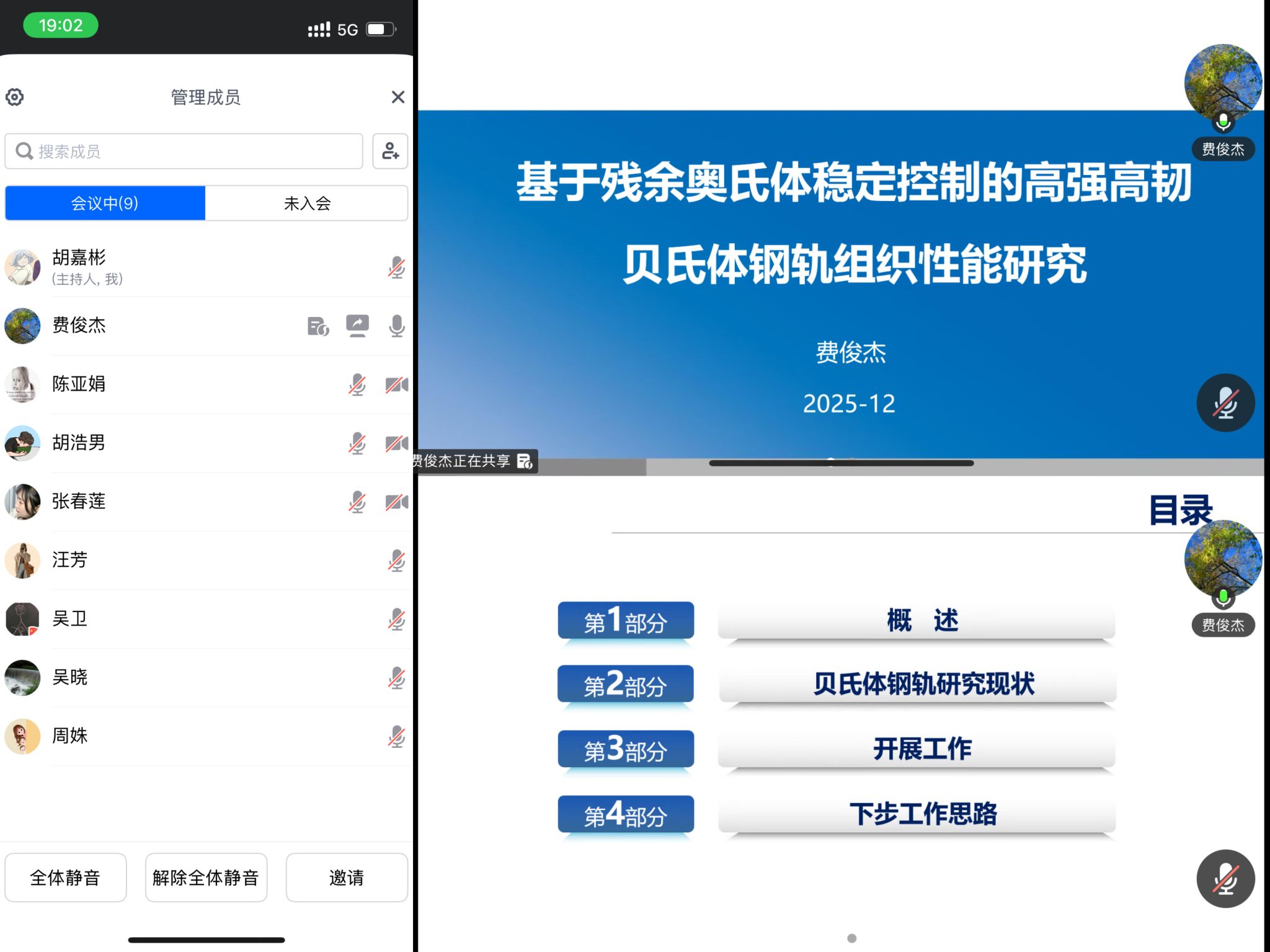费俊杰老师首先回顾了贝氏体钢轨的研究背景与现状,阐述了通过控制残余奥氏体以提高钢轨强韧性的重要意义。随后,他重点介绍了已开展的实验工作及取得的阶段性成果,并对下一步研究计划进行了详细说明。项目团队将在现有成分体系基础上进一步优化,降低合金含量;深入开展贝氏体钢轨轧后加速冷却工艺研究,以提升其综合性能;同时持续推进回火工艺研究,致力于建立工艺—组织—性能的控制模型,通过精准调控组织形貌与残余奥氏体分布,减少钢中残余奥氏体数量并增强其稳定性,从而为实现高强高韧贝氏体钢轨的工业化应用奠定理论基础。