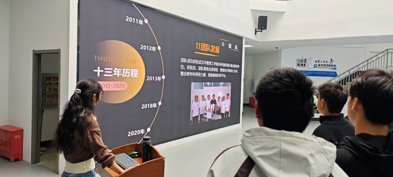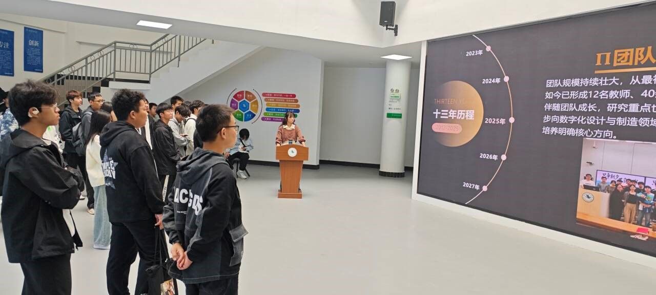 宣讲伊始,田玉婷以“探索先进制造,共赴科研之约”为主题,带领新生全面了解π团队先进制造工作室的发展历程与核心实力。她介绍,π团队由齐洪方、谈剑老师于2005年创建,初始仅5名学生,历经近20年成长,如今已形成12名教师、40余名在校学生的科研创新梯队。团队始终遵循“学习第一”等原则,聚焦先进设计与制造领域,不仅多次为企事业单位解决技术难题,更在平台建设与荣誉获取上成果亮眼:2018年入选湖北省高等学校优秀中青年科技创新团队,2020年获批校级科研创新团队重点建设单位,2024年先后通过校级B级产学研名师工作室验收、获评“湖北省科技攻关青年突击队”,硬核实力让在场新生频频点头认可。