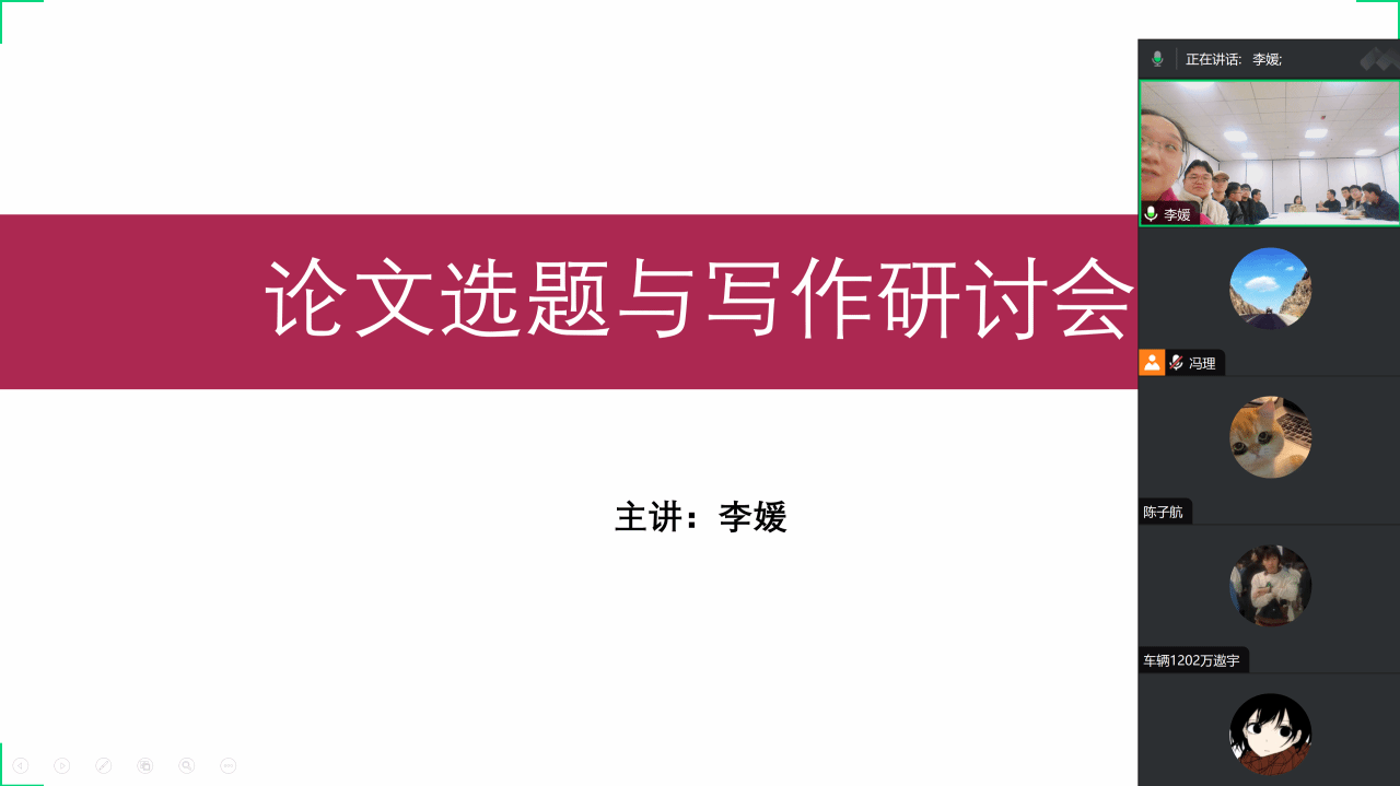 在研讨会上,李媛老师就论文选题的原则、写作技巧及学术规范进行了深入探讨。李老师指出,选题是论文写作的基础,一个好的选题能够激发学生研究的兴趣和动力。同时,李老师还分享了如何从日常学习中发掘选题、如何进行文献调研等方面的经验,讲解了论文写作的规范和技巧。最后,李老师强调了学术诚信的重要性,并就如何构建论文框架、如何进行有效的论证等方面进行了详细的指导。