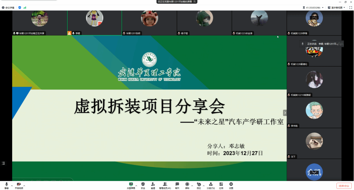 首先李媛老师简要介绍了邓志敏同学,该同学为车辆20级学生,大三加入了“未来之星”汽车产学研名师工作室,主要负责新能源汽车动力系统虚拟现实系统的开发项目,所参研的项目成果获得全国三维数字化创新设计大赛全国二等奖,同时该同学获得国家奖学金。