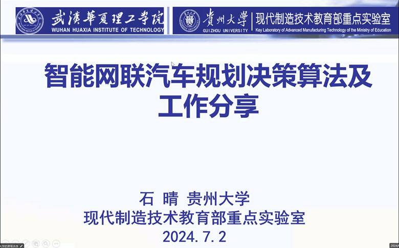 7月2日上午9:00,未来之星汽车产学研名师工作室线上腾讯会议召开了一场关于智能网联汽车路径规划算法与示例分享的汽车前沿技术讲座。会议由冯理、李媛两位项目负责人主持,参会学生100余人。本次会议邀请了贵州大学现代制造技术教育部重点实验室校聘副教授/硕士生导师石晴博士,旨在让学生深入了解智能网联汽车的核心技术,并探讨其在汽车产业中的实际应用。