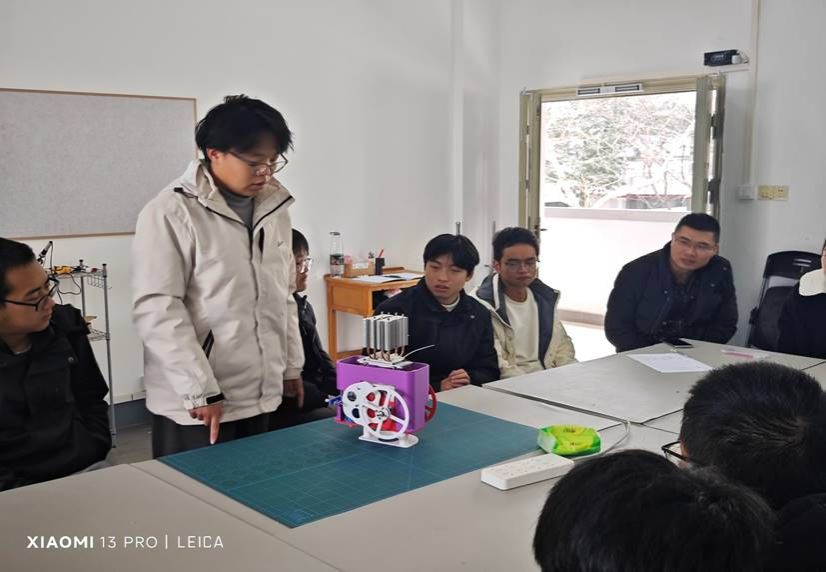 李本腾首先宣布了工作室成员名单调整及负责人换届事宜,进一步明确各级职责分工。其次,他介绍了2025年学科竞赛各赛项的要求,提出工作室会持续推行“双导师”制度,强化“传帮带”机制,通过经验传承与跨年级协作提升赛事质量。之后,由宫敬林介绍并展示了他参加工创比赛的新能源小车,借此激起工作室新成员的兴趣。
