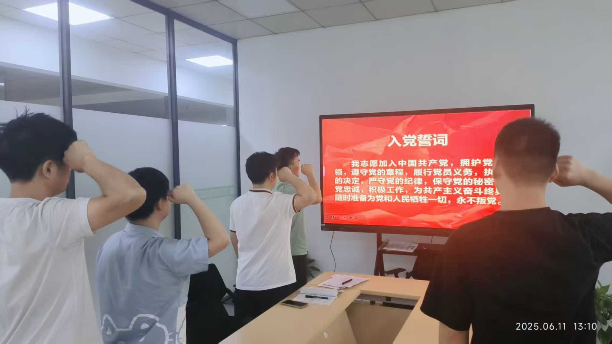 会上,刘江锋同志首先宣读《转正申请书》,从思想、工作、学习和生活等方面,全面汇报了预备期间的成长与进步。他提到,在党组织的培养教育下,自己不断加强理论学习,提升党性修养,积极参与党组织活动,在工作中主动担当,以实际行动践行对党的承诺,并对自身存在的不足进行了深刻反思,明确了今后的努力方向。