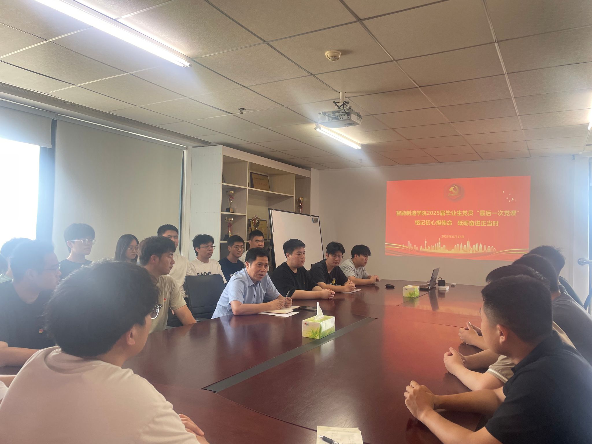 为深入贯彻中央八项规定精神学习教育,加强毕业生党员教育,6月17日,智能制造学院开展“铭记初心担使命,砥砺奋进正当时”2025届本科毕业生党员“最后一堂党课”。党总支副书记靳路民为毕业班党员授课,活动由党总支组织员祝炜黎主持。