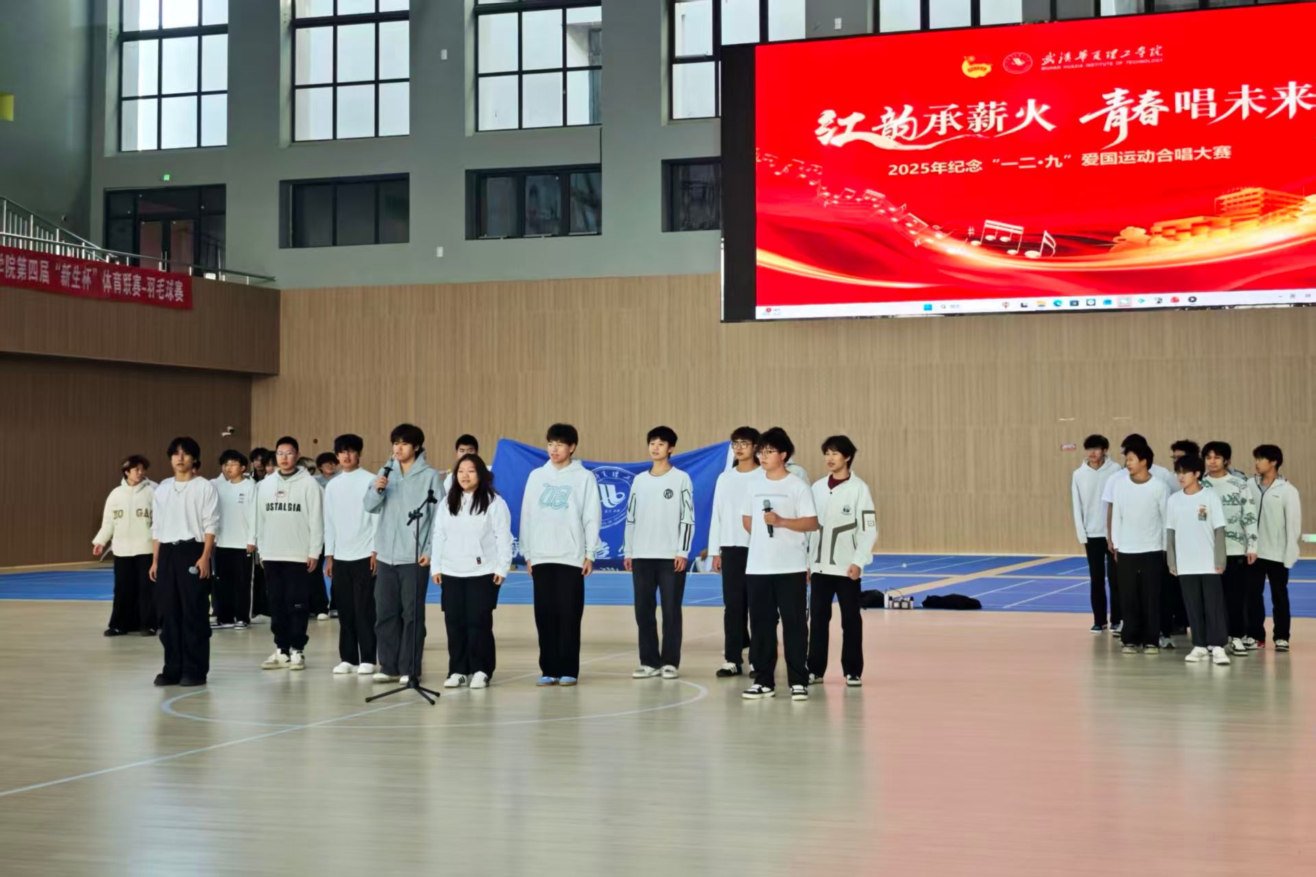 大赛现场分为户外与室内赛场,红色主题背景板醒目大气,主持人的精彩开场为赛事拉开帷幕。智能制造学院汽服1252班的同学们身着统一服装,以昂扬的姿态登上舞台。在体育馆赛场,他们唱响经典励志歌曲《奔跑》,“随风奔跑自由是方向,追逐雷和闪电的力量”的歌声铿锵有力,节奏明快的旋律搭配整齐的队列,将当代工科青年敢闯敢拼、奋勇向前的精神展现得淋漓尽致,现场掌声不断。