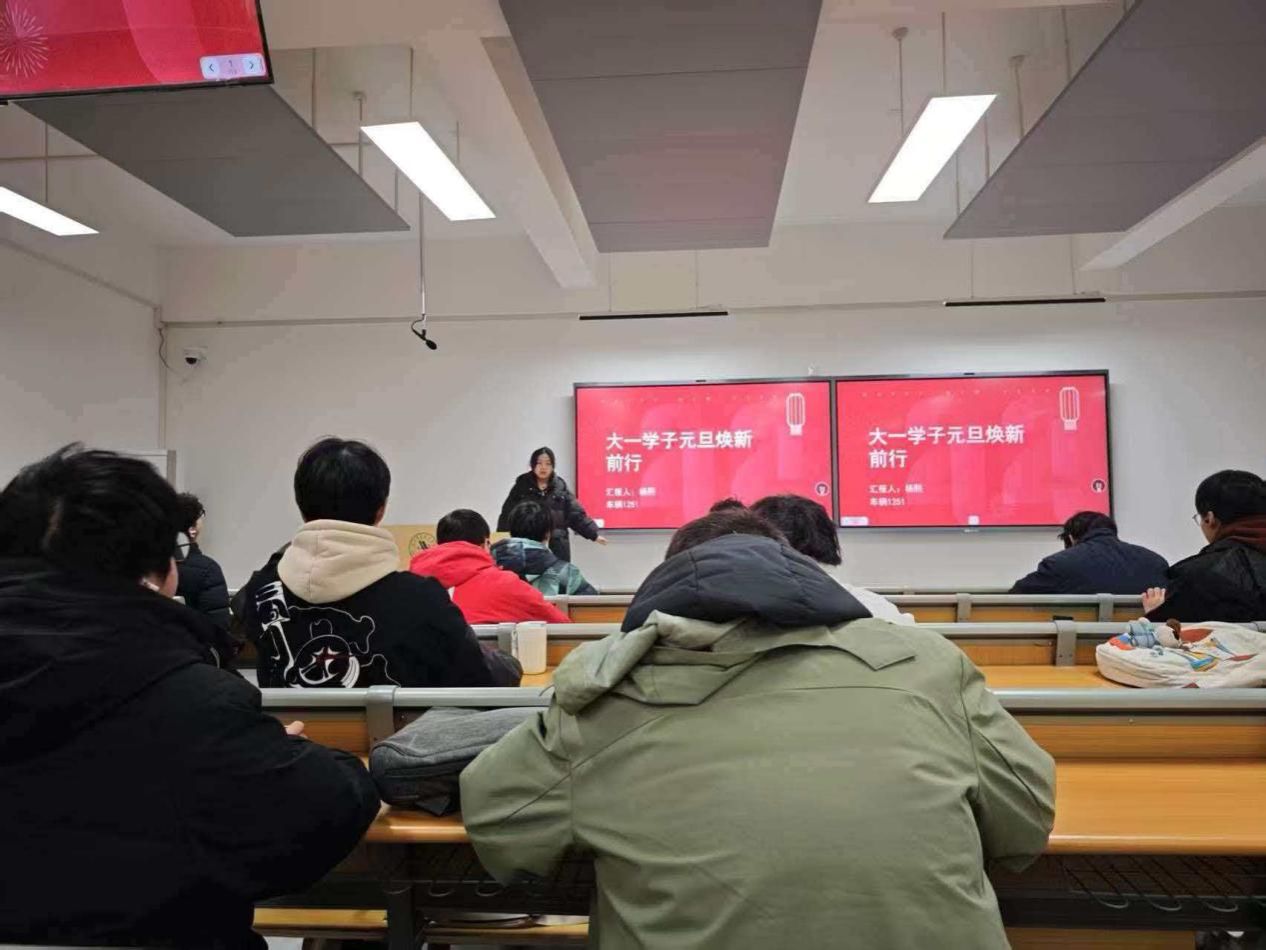 为迎接元旦佳节,引导大一学子总结过往、展望未来,12月29日,车辆1251班在教室开展“岁序更替,焕新前行迎元旦”主题团课,本次团课由杨熙主讲,全体同学参与其中。