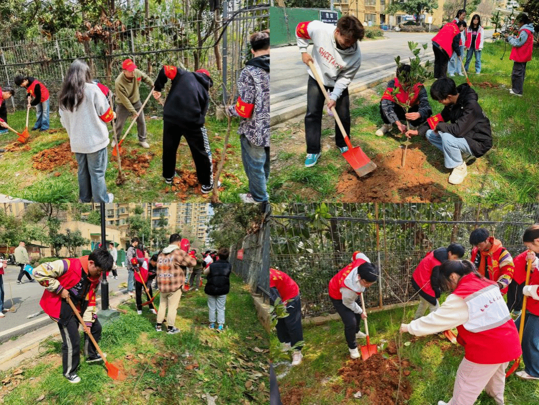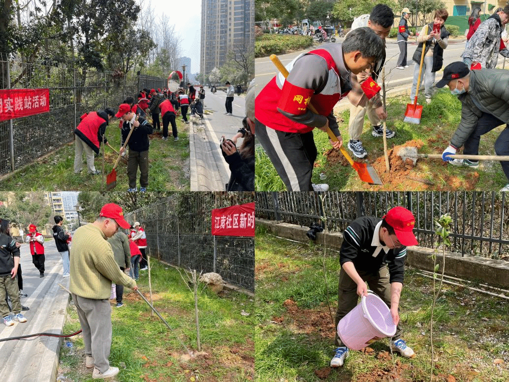 活动现场,在光谷理想城物业相关技术人员的指导下,参与植树的领导和师生分工协作,大家整地挖坑、栽植树苗、挥锹培土、扶苗压实,最后提水浇灌,各道工序有条不紊,现场一派热火朝天的劳动景象。每一个步骤都充满了对生命的尊重和对自然的敬畏。目之所及都是一片令人舒心的绿意,到处是勤恳忙碌的身影,伴随着的是一片悦耳的欢声笑语!大家都在用行动践行着“我劳动我光荣,我奉献我快乐”的新时代雷锋精神。众人拾柴火焰高,众人植树树成林。经过近一个小时的辛勤劳动,38颗幼小的树苗在江南社区安家落户,春风拂过,一棵棵树苗迎风而立,焕发出勃勃生机。