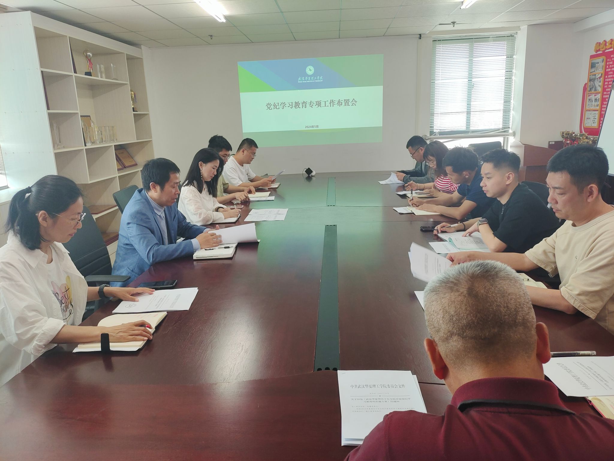 5月7日,智能制造学院在综合楼919会议室召开党纪学习教育专项工作布置会,学院党总支书记靳路民、党总支组织员祝炜黎、学工办主任向胜涛和教工、学生党支部书记参加会议,会议由党总支书记靳路民主持。