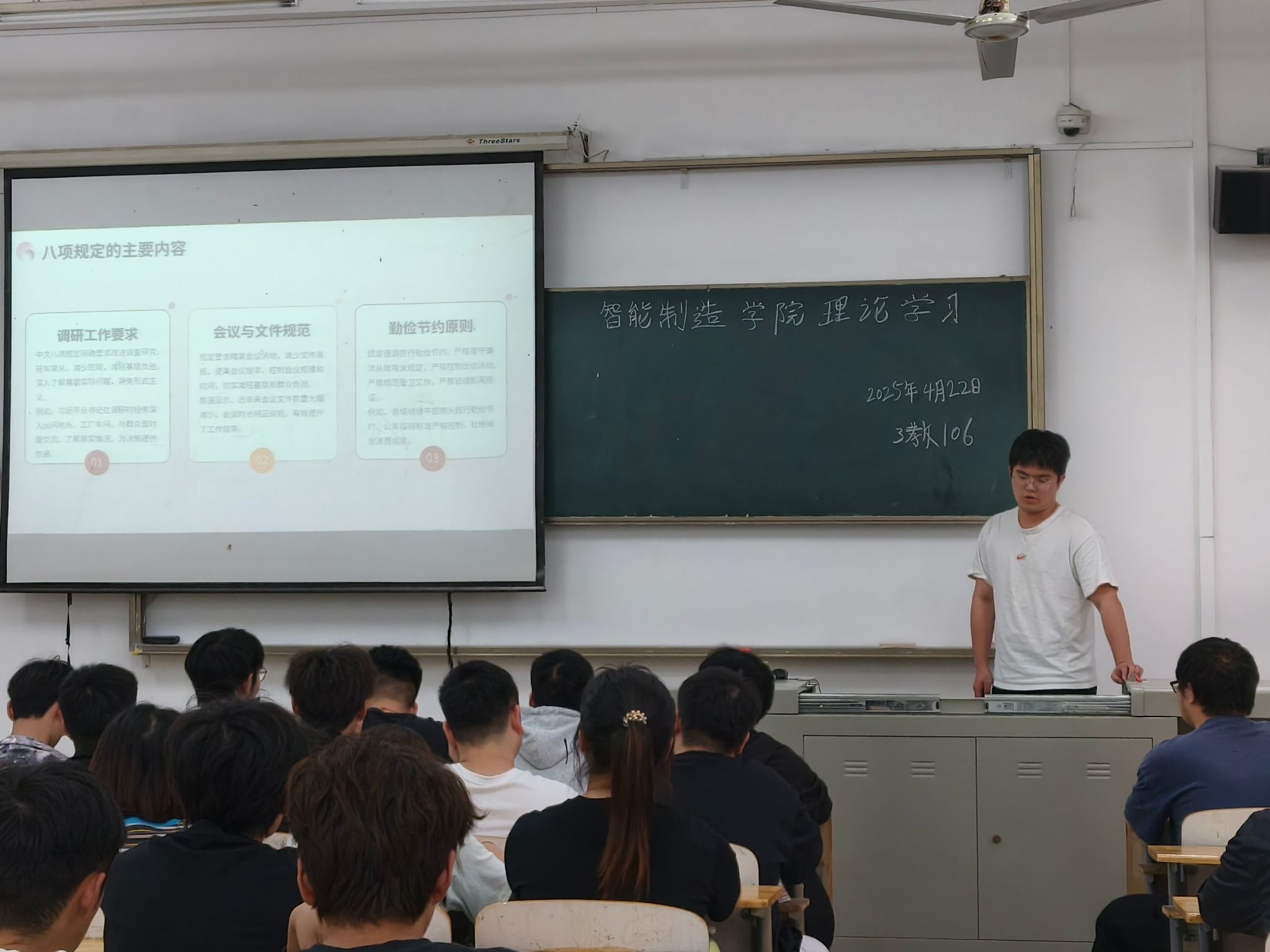 4月22日,智能制造学院学生党员齐聚3-106教室,开展了一场以“深刻领会中央八项规定精神”为主题的理论学习活动。此次活动围绕深入贯彻中央八项规定精神展开,旨在强化学生党员的纪律意识,推动作风建设迈向新高度。此次活动吸引了众多党员积极参与,现场学习氛围浓厚。