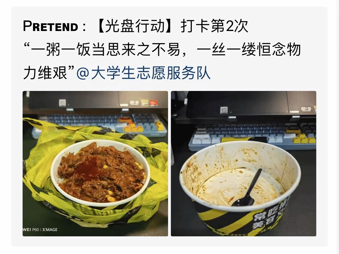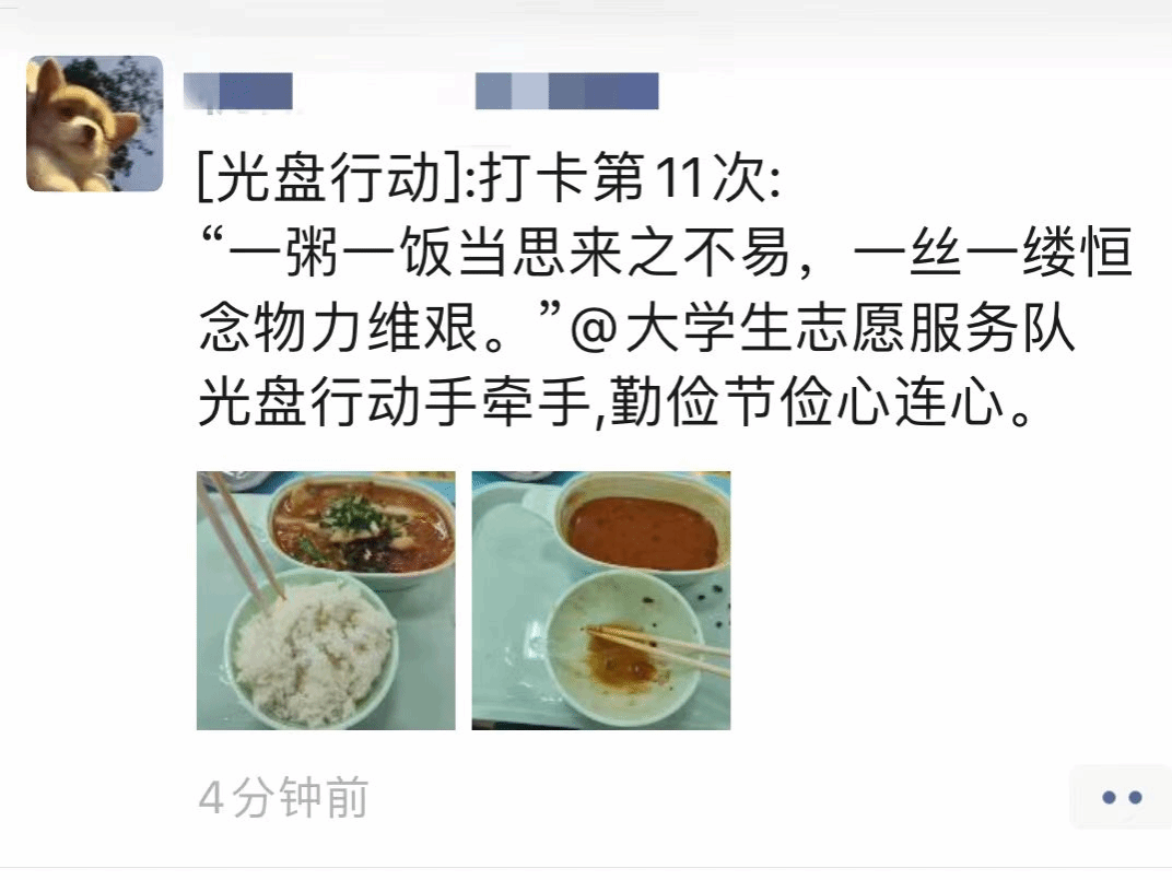 这次活动从2023年11月20日至26日截止,一共一周时间。打卡形式为,每天一日三餐之后,参与者只需要拍下吃完后的光盘,并将照片发到朋友圈或者QQ动态上进行打卡。这样一来,不仅可以提醒自己要珍惜粮食,还可以通过社交媒体的传播,影响更多的人。这种形式的活动非常有趣,不仅能够让大家参与其中,还能够增加大家的互动和交流,让更多的人了解到光盘行动的重要性。