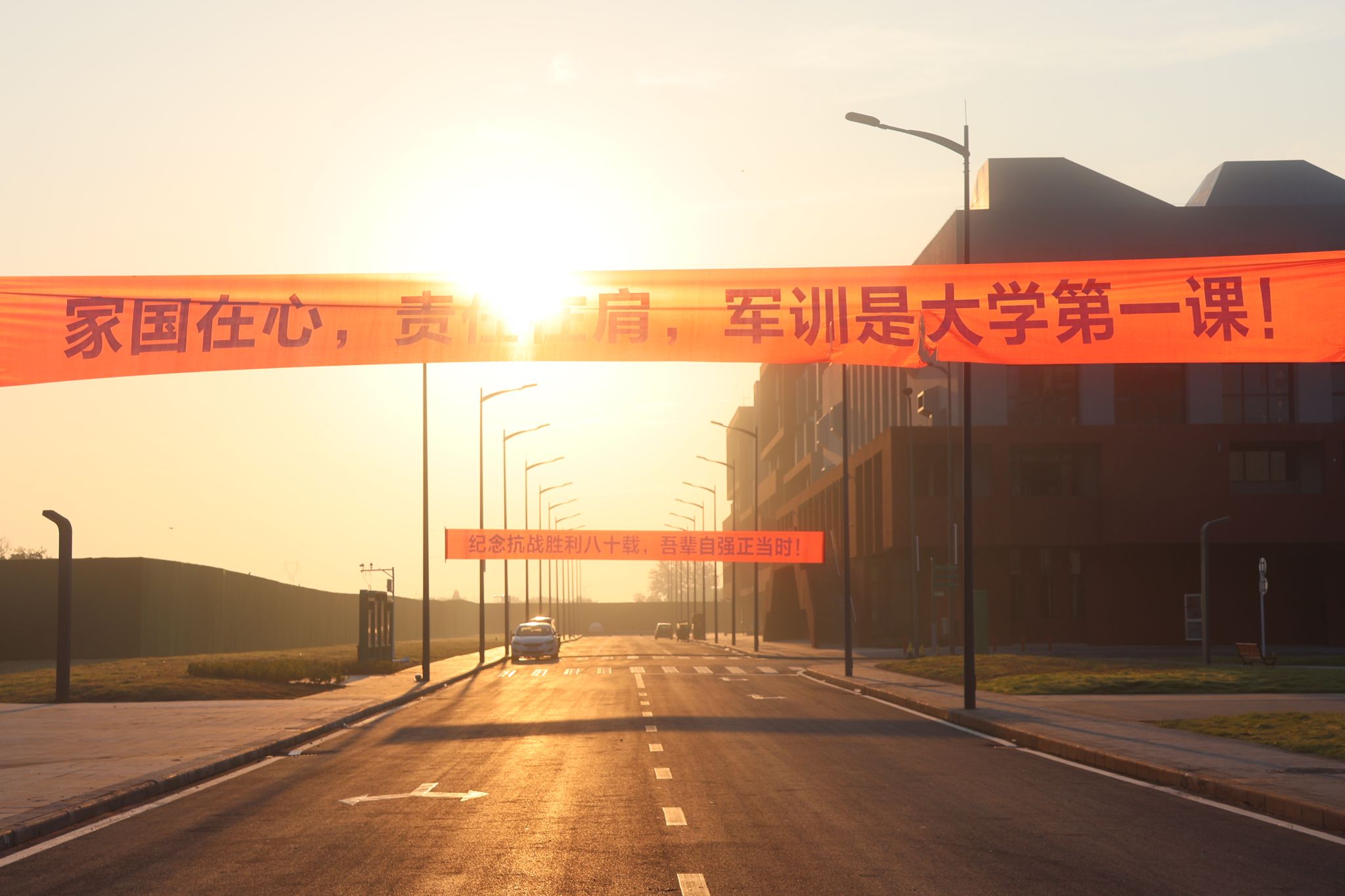 宽阔的校道在晨光里延伸,像极了新生们即将开启的大学征程——有朝阳为伴,有责任为帆,他们将在军训的淬炼中褪去青涩,在家国情怀的滋养下书写属于自己的自强篇章。