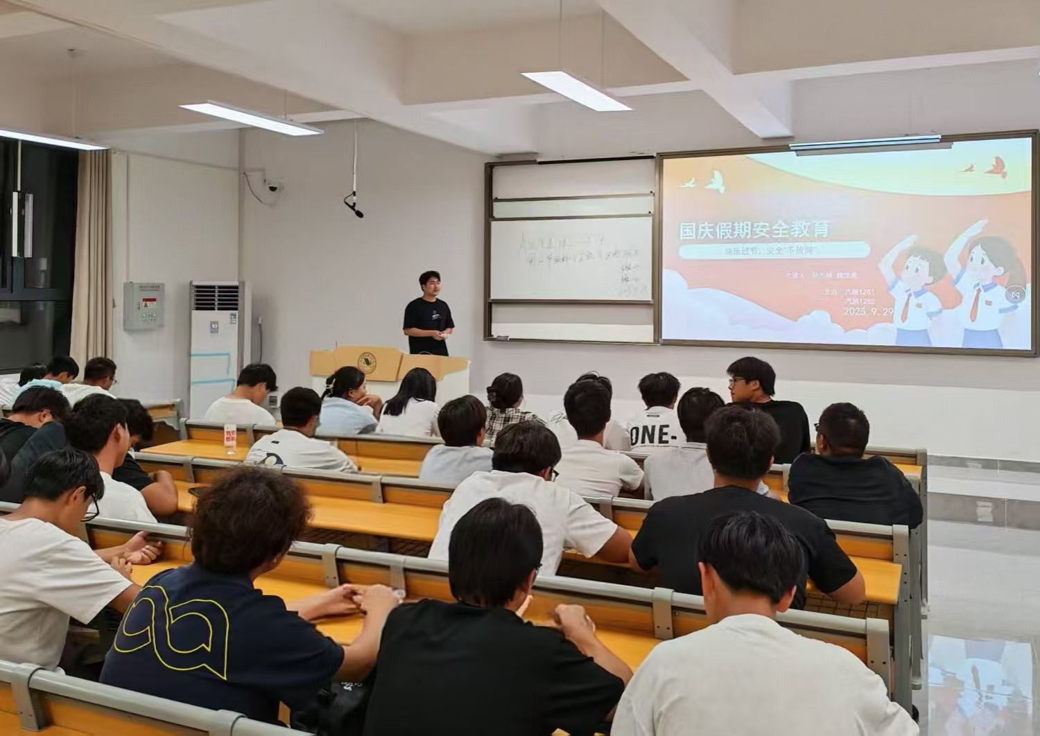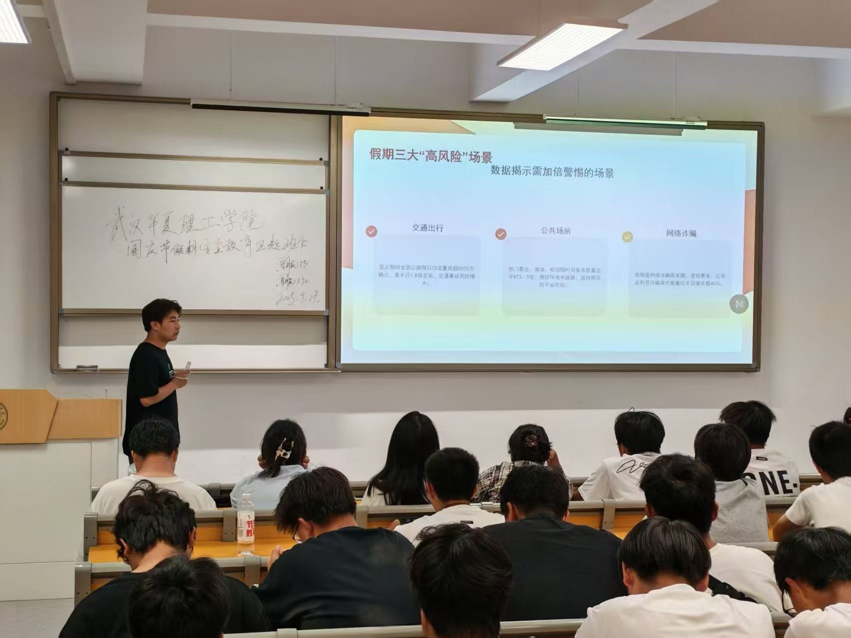 班会现场,主讲人孙志赫围绕“快乐过节,安全不放假”的核心主题,从交通安全“国庆出行人流、车流密集,要严格遵守交通规则,切勿乘坐无资质车辆”、消防安全“注意用电、用火安全,离开宿舍务必切断电源”、财产安全“警惕网络诈骗、盗窃行为,保管好个人财物及证件”、防疫安全“保持良好卫生习惯,人群密集处做好防护”等多个维度展开讲解。通过案例分析、互动问答等形式,让安全知识入脑入心,引导学生时刻绷紧安全弦。