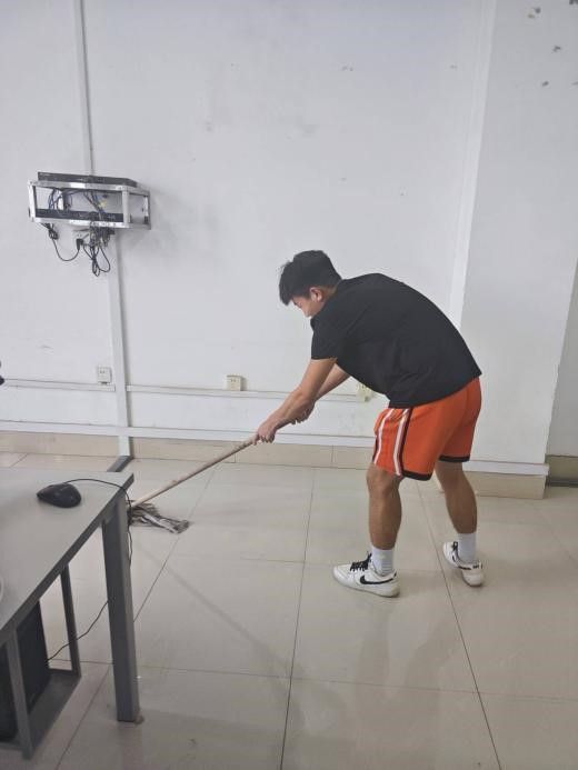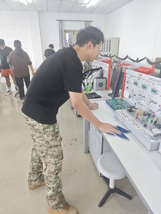 劳动结束后,632-1实验室焕然一新:地面无任何灰尘与杂物,瓷砖缝隙干净整洁;实验台台面光亮无污渍,边缘缝隙无残留;实验器具与电子元器件外壳一尘不染,摆放整齐。看着自己的劳动成果,学生们纷纷露出笑容。发展对象林同学说:“从扫地到擦器具,每一步都需要耐心,让我明白哪怕是简单的清洁劳动,也得认真对待。” 共青团员刘同学也表示:“以前做实验时只关注操作,这次亲手清洁设备,才知道维护实验室环境需要这么多细节,以后会更爱护实验器材。”
