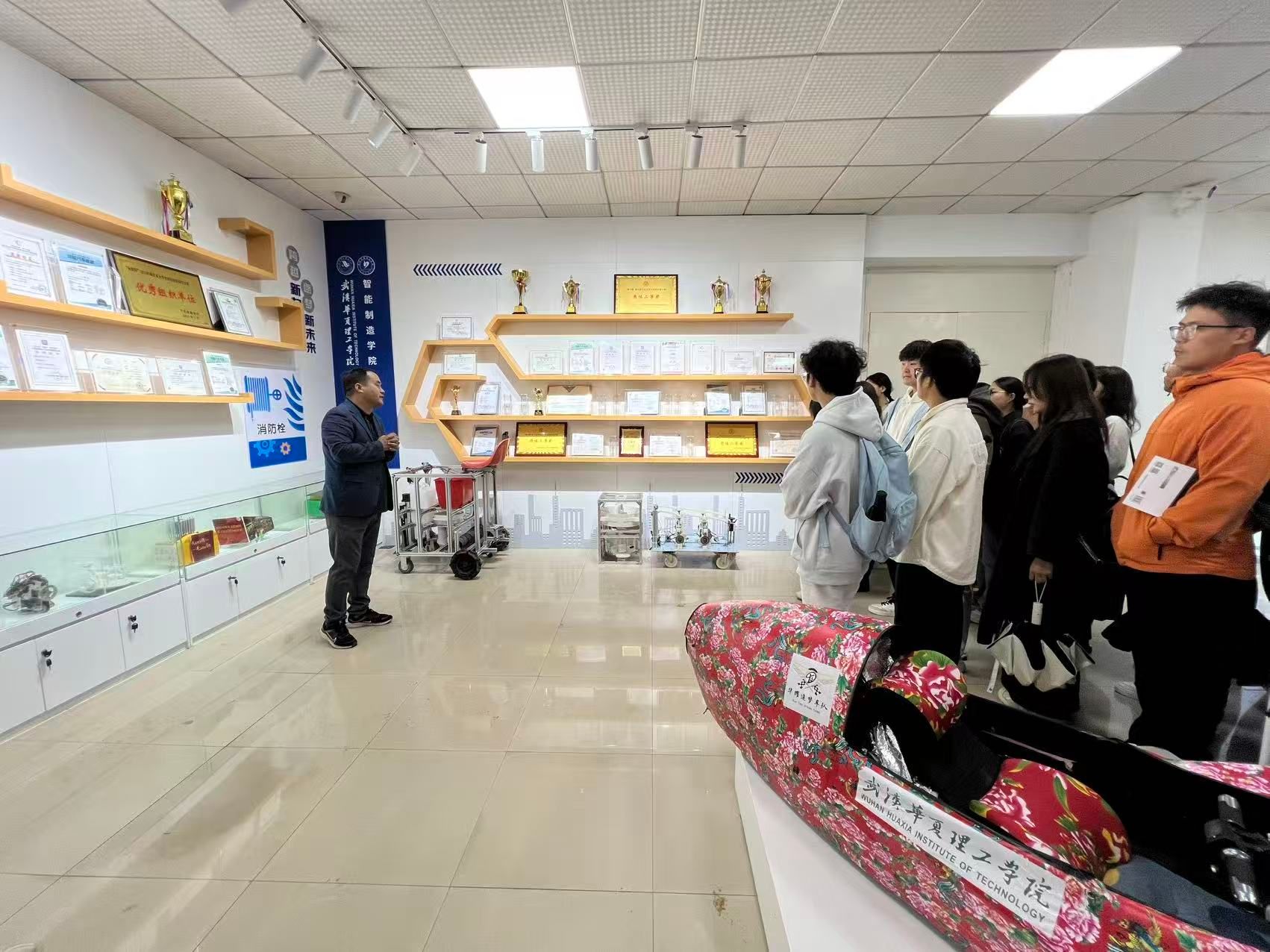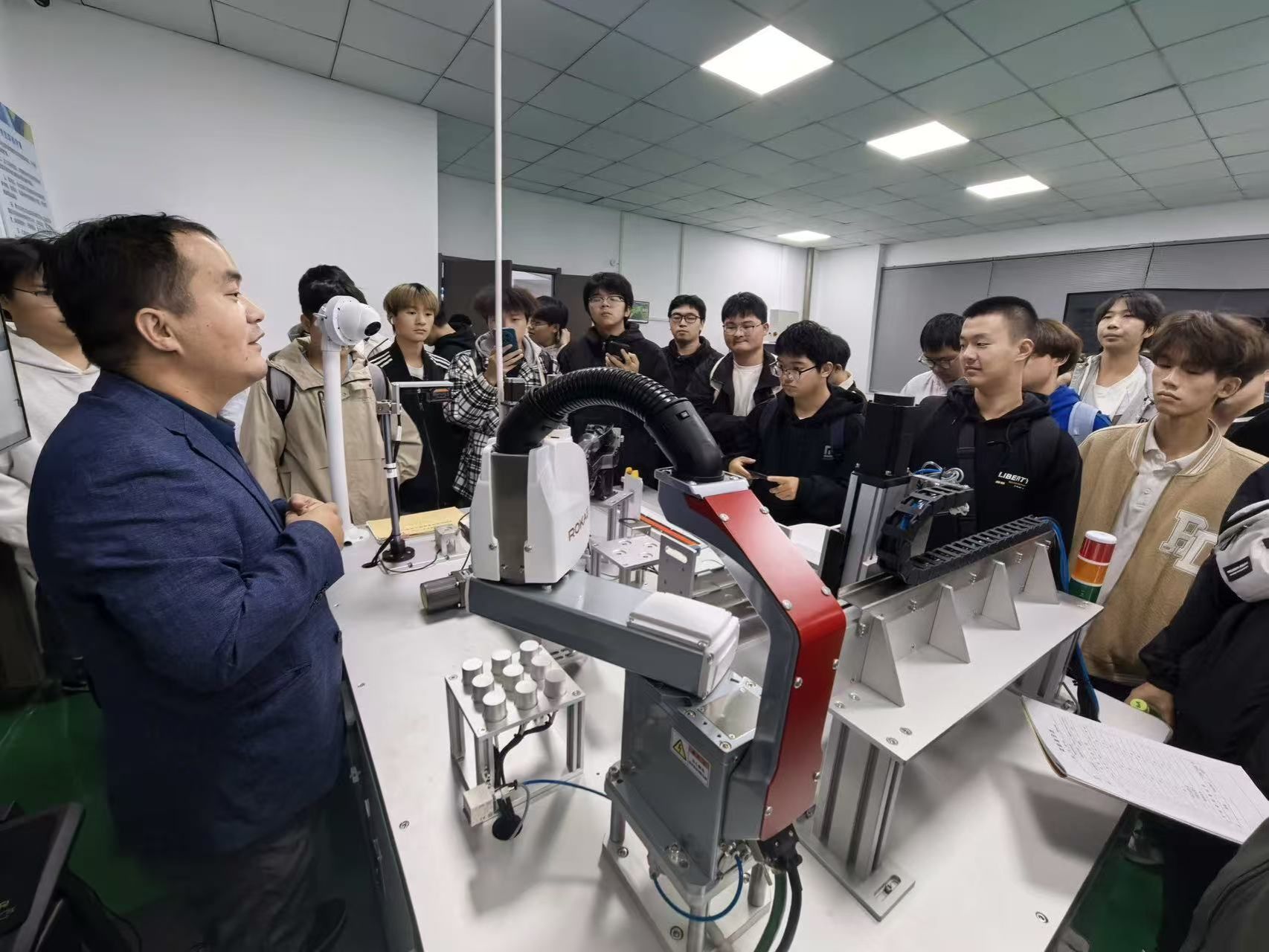 随后,汤剑老师带领同学们参观了每间实验室。从精密的数控机床到智能的工业机器人,从先进的自动化生产线到前沿的智能控制系统,汤老师通过生动的实例和专业的讲解,让同学们了解到智能制造在现代工业生产中的重要地位和广泛应用。同学们认真聆听,不时提问,与汤老师积极互动,现场学习氛围十分浓厚。
