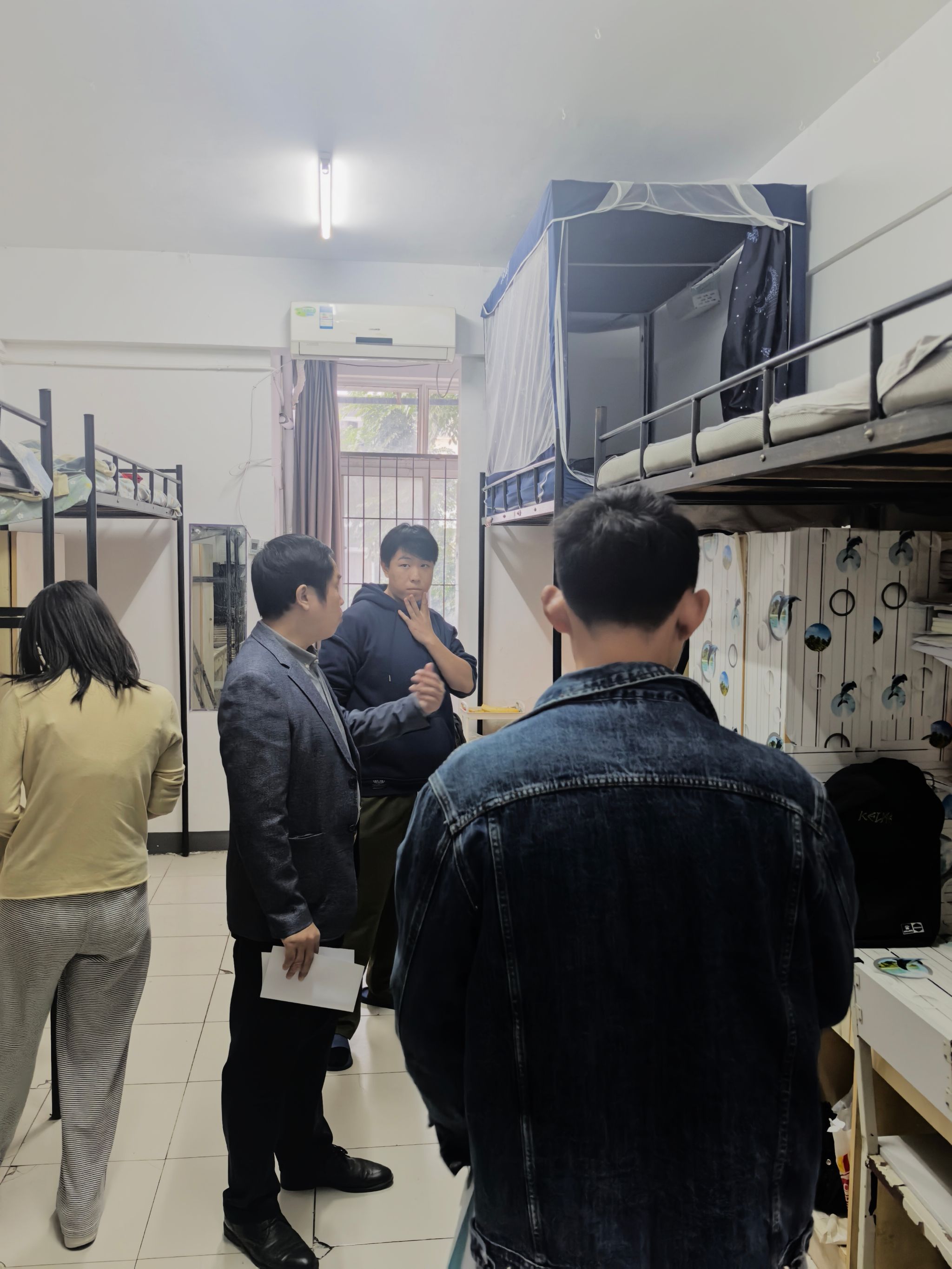 检查过程中,靳书记一行按照事先规划的路线,对抽到的宿舍进行细致查看。每到一间宿舍,书记都主动与同学们亲切交流,详细询问大家的学习进度、生活需求以及遇到的困难,叮嘱同学们在紧张的学习之余要注意劳逸结合,保持良好的生活作息。在关注学生生活状态的同时,检查小组重点围绕宿舍安全隐患展开排查,对宿舍内是否违规使用大功率电器(如电热毯、电火锅等)、私拉乱接电线情况、宿舍卫生是否整洁、物品摆放是否规范等问题进行了逐一核查。