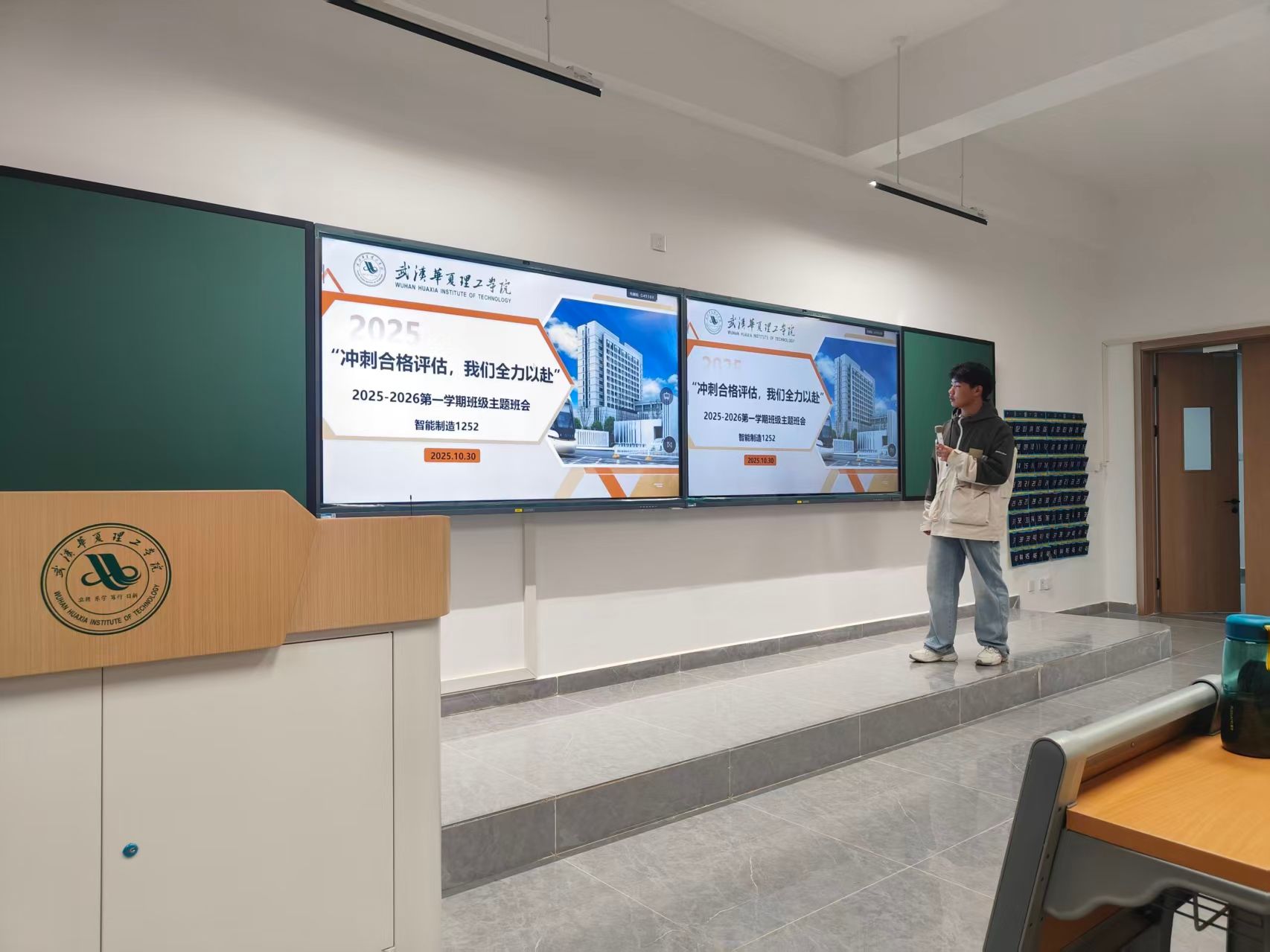 讲台前的屏幕上,“冲刺合格评估,我们全力以赴”的字样与校徽相映,班长的身影立在光影之间,像一株锚定方向的树。教室的空气里,既有晚自习独有的沉静,又藏着青春奔赴目标的热望——这场班会,是为成长立界,也是为集体铸魂。