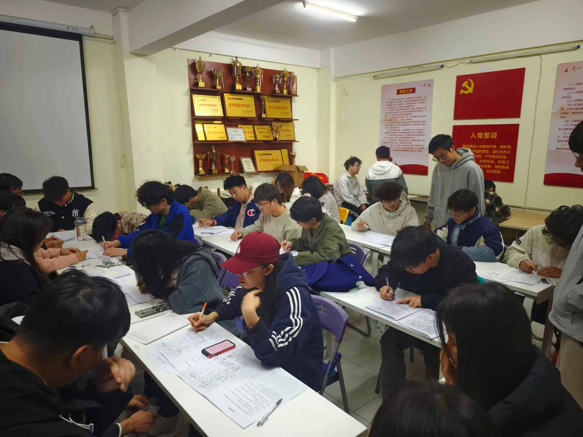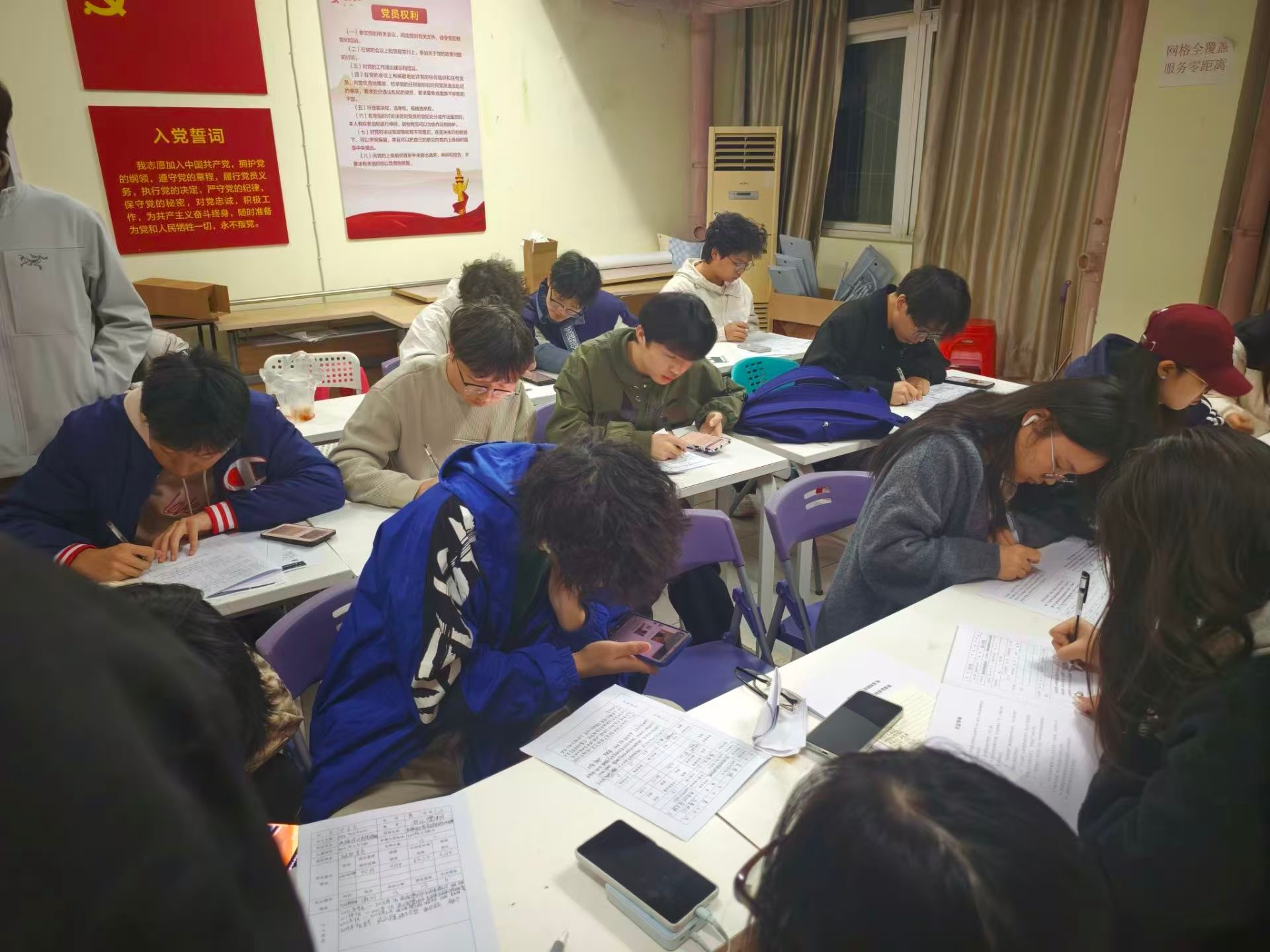 台灯的光晕里,同学们或埋头刷题、专注钻研,或轻声交流、探讨难题。从词汇积累到语法梳理,从听力训练到写作构思,每一个学习环节都有条不紊。墙面的荣誉陈列与党建文化展板相映成趣,既为学习场景增添了文化底蕴,也让学子们在浓厚的氛围中坚定了学习的信念。