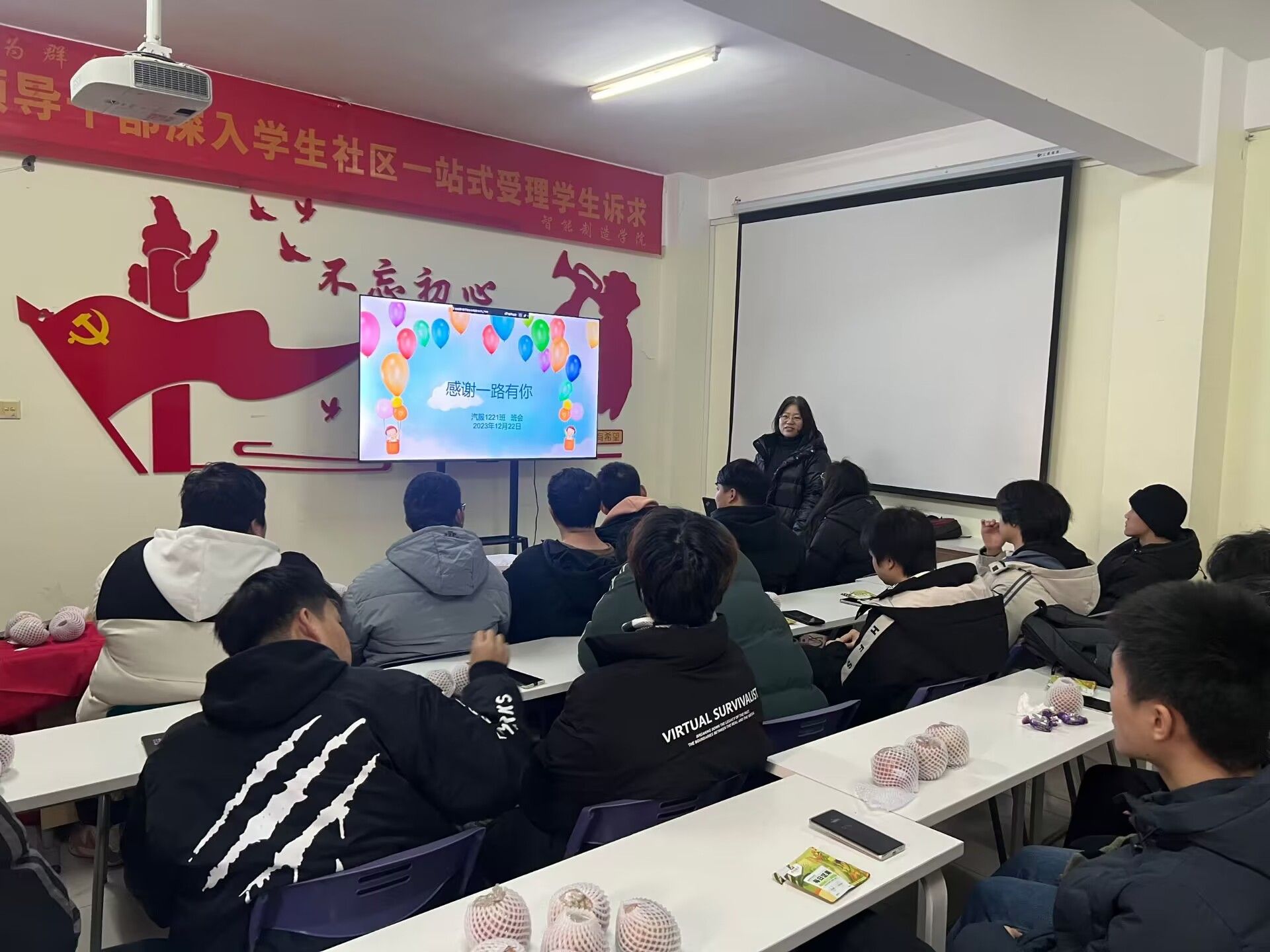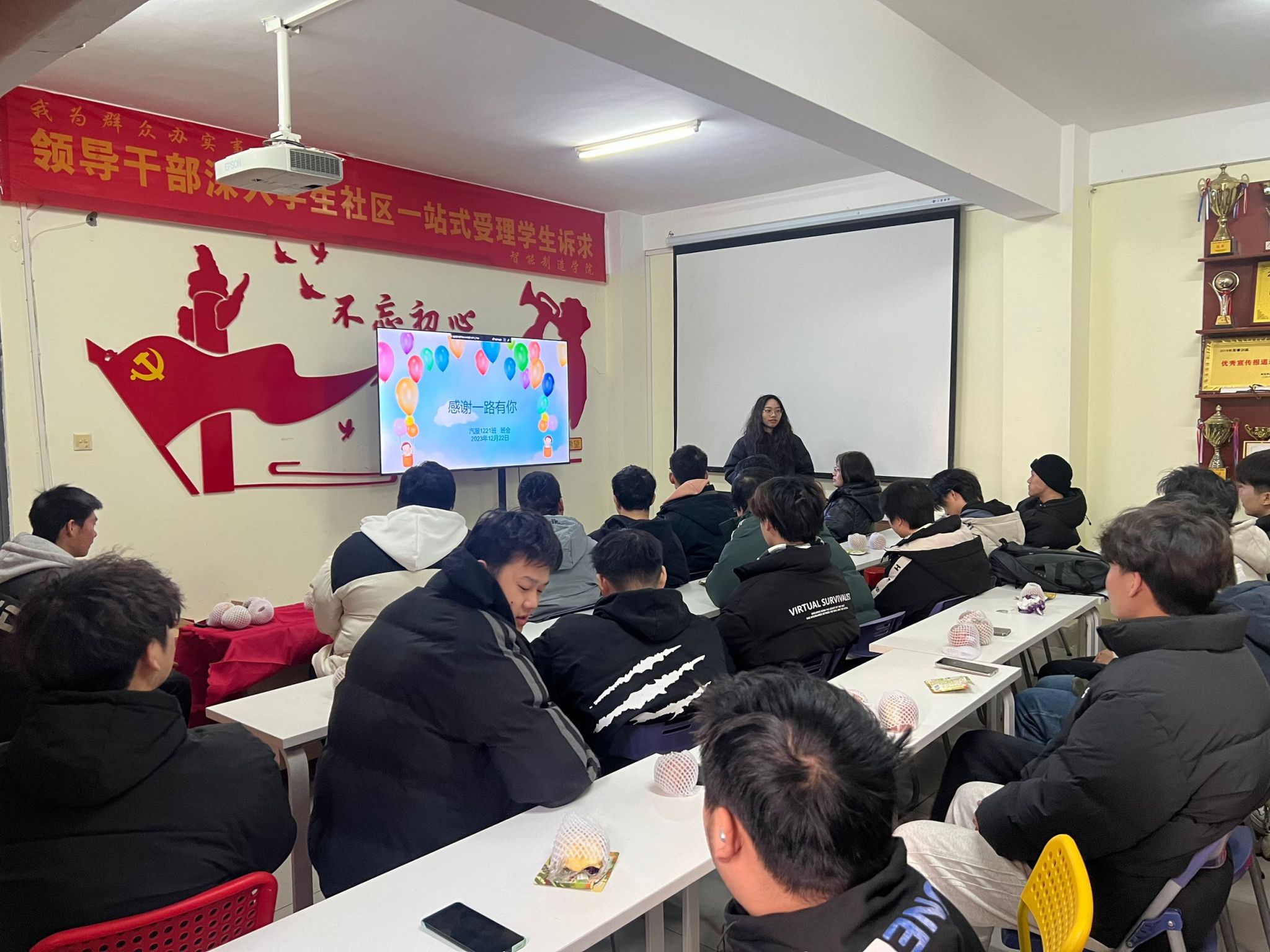 2023年12月24日,汽服1221班在二号楼学生社区召开主题班会《感谢一路有你》。本次班会的主要目的是帮助同学们更好地认识自我、规划未来,助力班级建设。会议由导师班主任曾志娥主持,辅导员李娇和汽服1221班全体学生参加了会议。