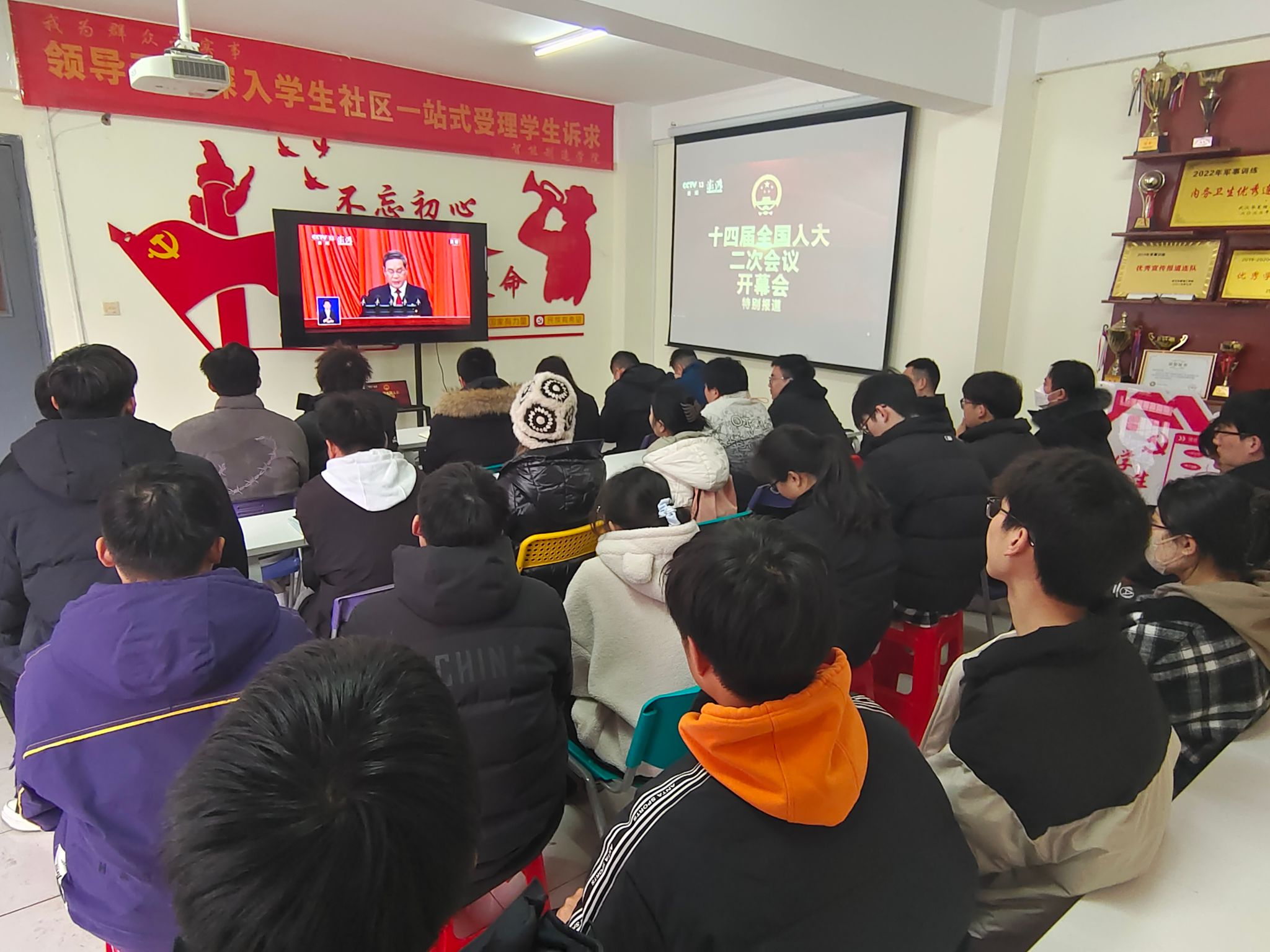 2024年3月5日上午9时,第十四届全国人民代表大会第二次会议在北京人民大会堂隆重开幕。智能制造学院师生在逸思楼学生社区进行集体观看学习。