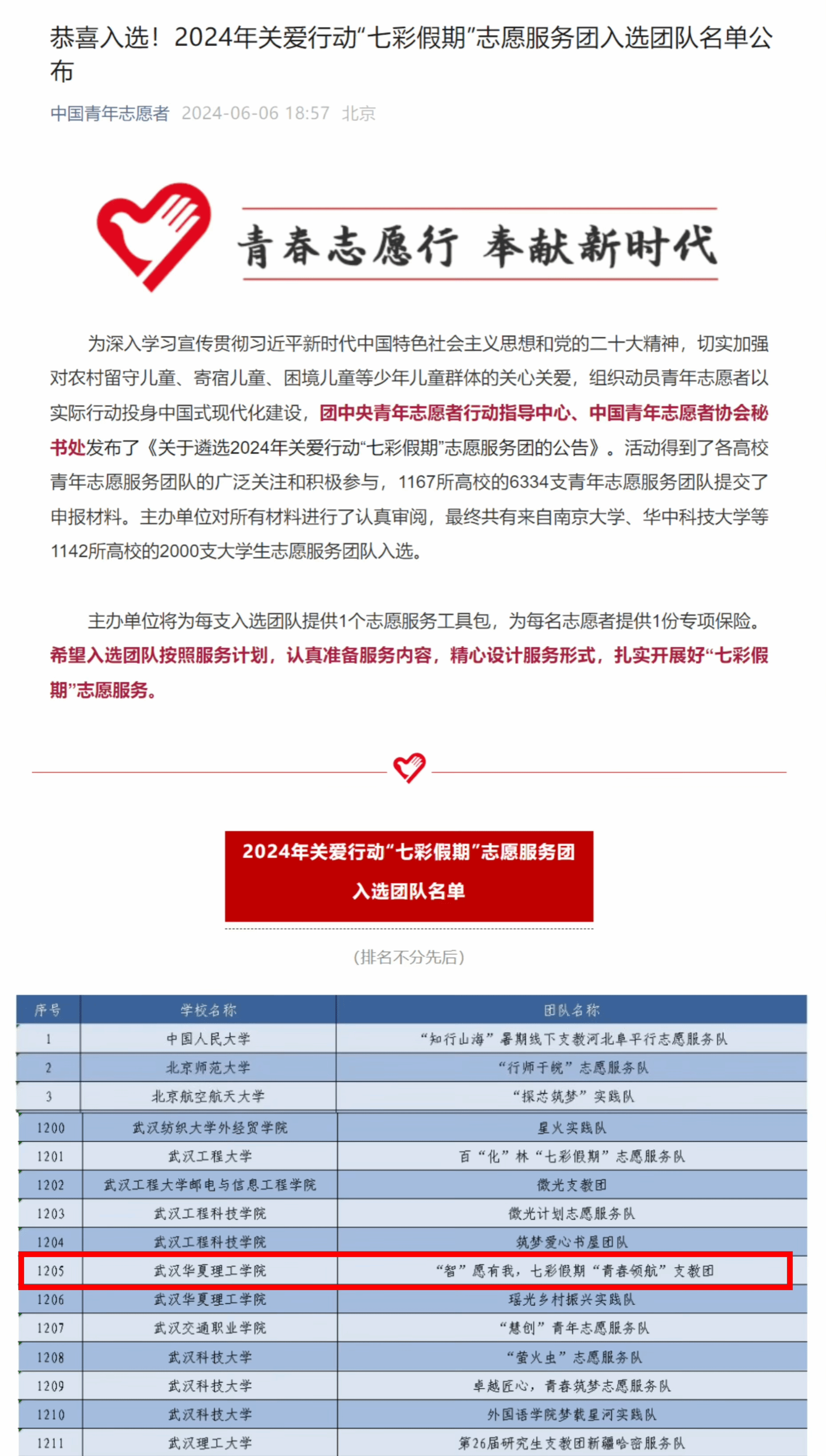 为深入学习宣传贯彻习近平新时代中国特色社会主义思想和党的二十大精神,切实加强对农村留守儿童、寄宿儿童、困境儿童等少年儿童群体的关心关爱,组织动员青年志愿者以实际行动投身中国式现代化建设,团中央青年志愿者行动指导中心、中国青年志愿者协会秘书处发布了《关于遴选2024年关爱行动“七彩假期”志愿服务团的公告》。活动得到了各高校青年志愿服务团队的广泛关注和积极参与,1167所高校的6334支青年志愿服务团队提交了申报材料。主办单位对所有材料进行了认真审阅,最终共有来自南京大学、华中科技大学等1142所高校的2000支大学生志愿服务团队入选。其中,智能制造学院“智”愿有我,七彩假期“青春领航”支教团成功入选。