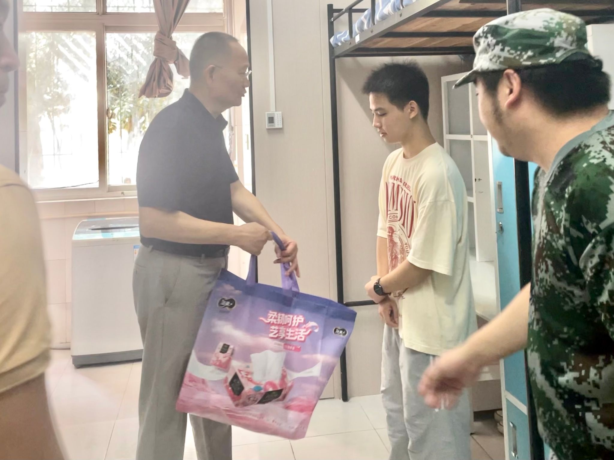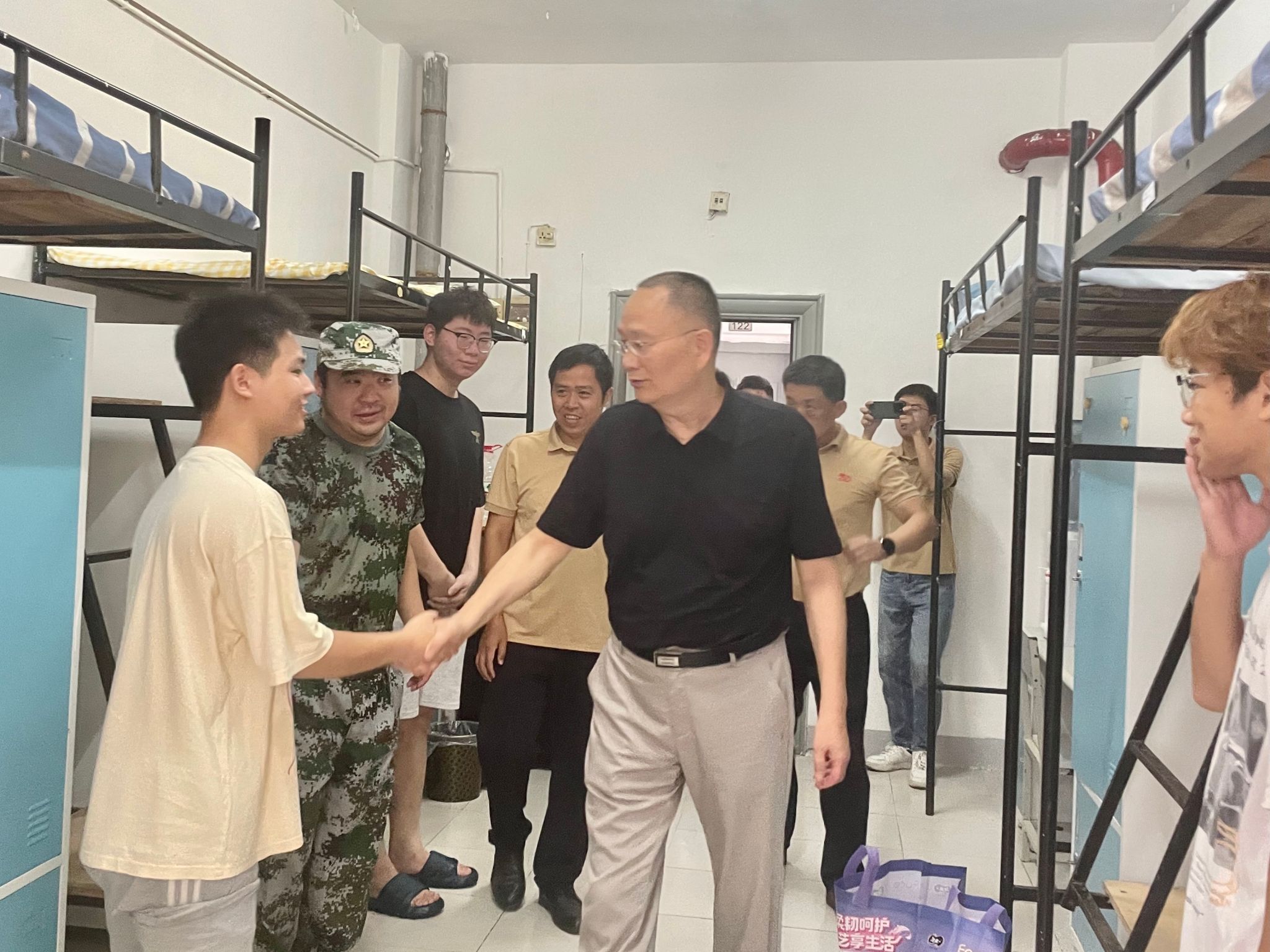 慰问过程中,吴永桥校长亲切地和家庭经济困难学生亲切交谈,了解他们家庭现状及对大学生活期待,并送上了慰问物资。同学们表示,从开学进入校园,就得到了志愿者和学长们的诸多帮助,辅导员日常关怀等,生活中还有校长会来宿舍慰问关怀,大家感到非常惊喜和感动,对即将开启的大学时光充满了信心和期待。