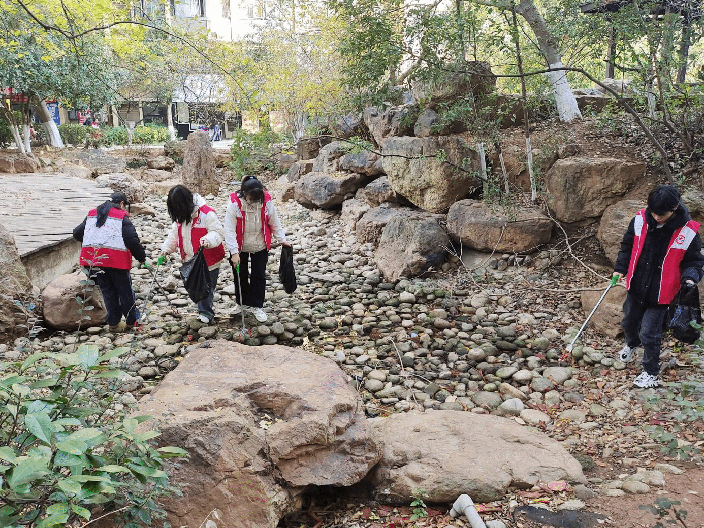 更有志愿者深入其中,公园里的石头大大小小,杂乱无章地躺在那里,垃圾就像不受欢迎的外来者,偷偷地藏在石头缝隙间。志愿者们不怕脏、不怕累,眼睛像扫描仪一样敏锐,不放过任何一处垃圾。他们弯下腰的身影,好似在和大地亲密拥抱,感谢它的无私馈赠,同时也在为它清理污垢。他们的行动如同春风吹过大地,让公园这个美丽的脸庞更加洁净;又像一首无声的赞歌,传递着保护环境的理念。