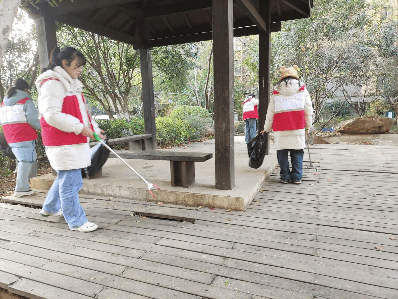 更有志愿者深入社区中心发现社区居民时长休息的地点——凉亭。志愿者们分工明确,有的人在清扫木质地板上的落叶和垃圾,有的人在清理长椅周围的杂物,还有的人在检查凉亭的卫生情况。他们认真地工作着,不放过任何一个角落,就连藏在木板缝隙里的烟头也被他们一一夹起。