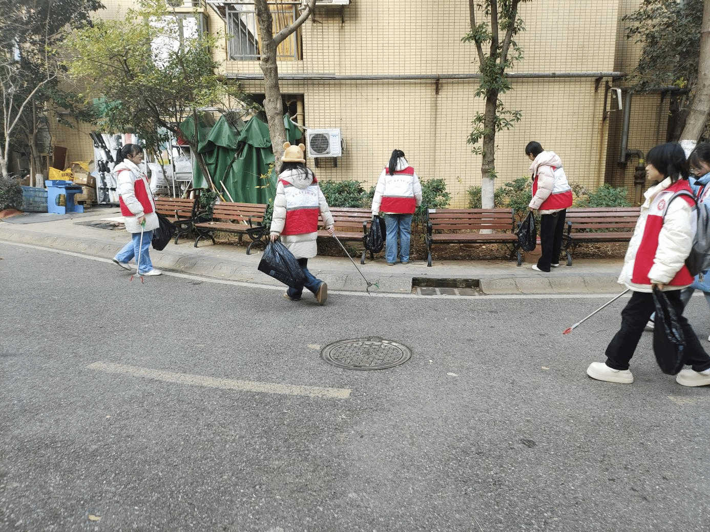 本次志愿服务活动由陈晓玲、吴玟璇、雷康等志愿者参加。瞧!他们持夹拿袋正前往社区各个地方,有的志愿者凭借犀利的眼光在途中发现公共座椅附近的垃圾并将其一一拾起,灵活的身影在座椅周边忙碌不停,饮料瓶、零食包装袋、废弃纸巾,统统都被精准“捕捉”,不放过任何一处卫生死角。