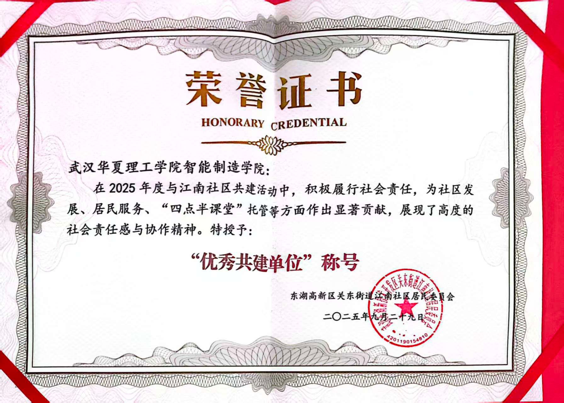 【志愿服务】江南社区居民委员会授予智能制造学院“优秀共建单位”称号