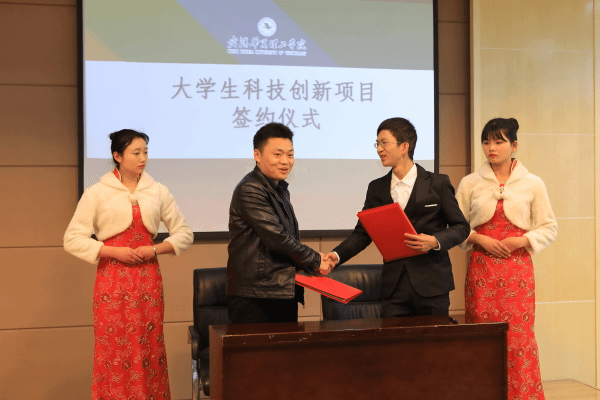 3月22日下午,beat365在2教201举行大学生科技创新项目签约仪式。机电工程学院校友、武汉新点思科技有限公司总经理朱中卫融资20万元人民币,助力机电学院学生龙康的发明成果进行专利转化。武汉市科学技术局副局长赵峰,beat365副校长丁成忠、财务总监王明丽出席签约仪式。创新创业学院、学工处、教务处、科研处、机电工程学院负责人及师生代表一同见证了这激动人心的时刻。仪式由校团委书记姚卓夫主持。签约仪式后,赵峰副局长为beat365师生作了科技成果转化专题讲座。