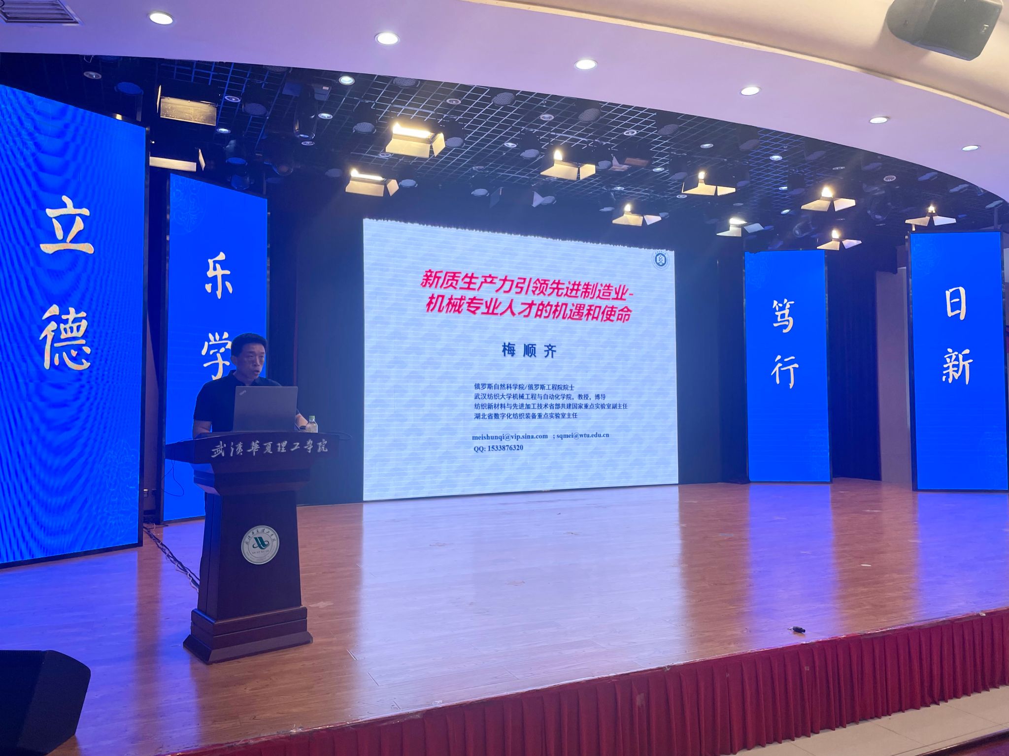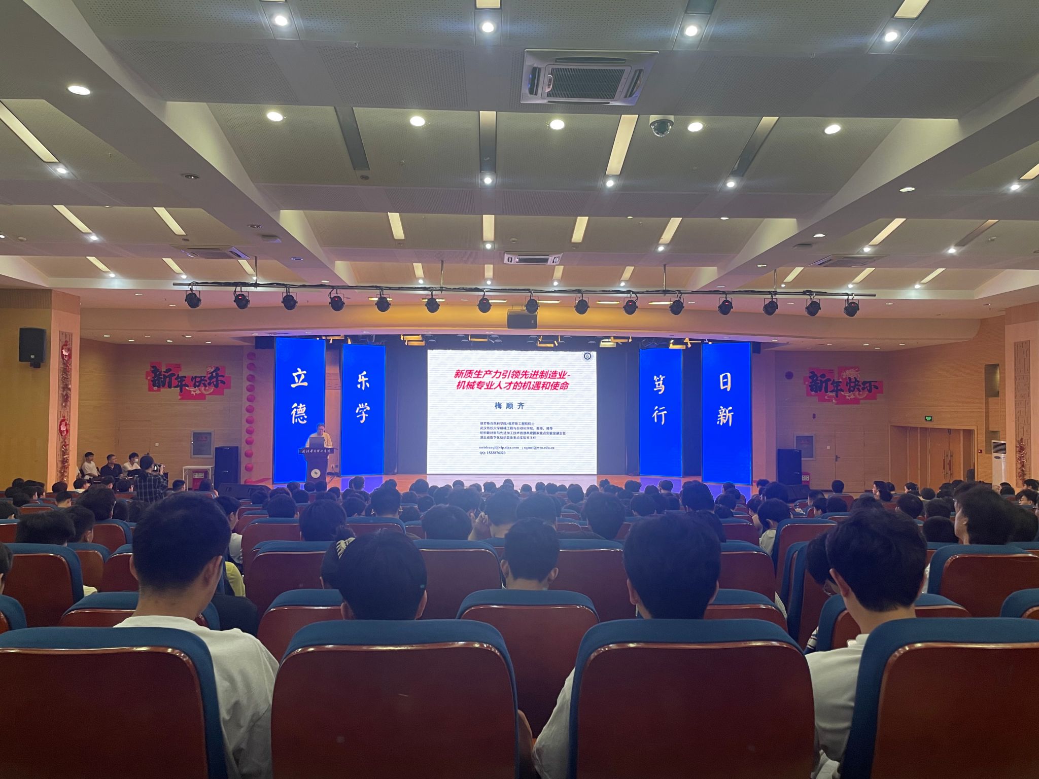 5月23日上午,应beat365官方网站智能制造学院邀请,教育部“黄大年式教师团队”负责人、纺织新材料及先进加工技术国家重点实验室副主任、湖北省数字化纺织装备重点实验室主任、武汉纺织大学教授梅顺齐在综合楼学术报告厅为我院师生做了题为“新质生产力引领制造业——机械类专业人才的机遇和使命”的学术报告。报告会由智能制造学院执行院长齐洪方主持,学院领导班子、专职老师和500余名同学现场聆听了报告。